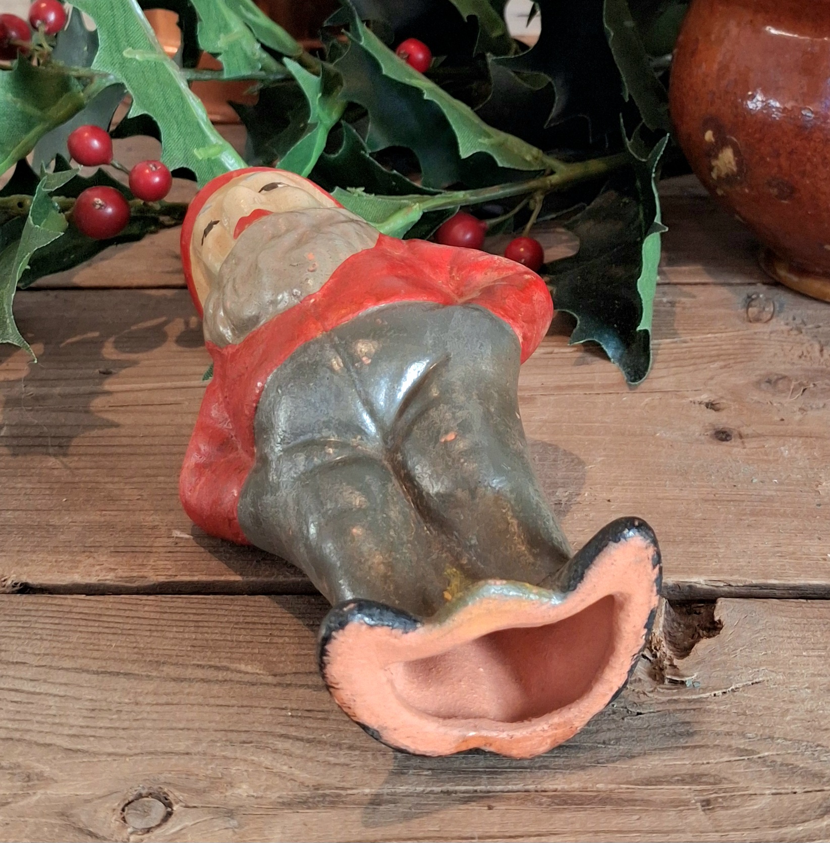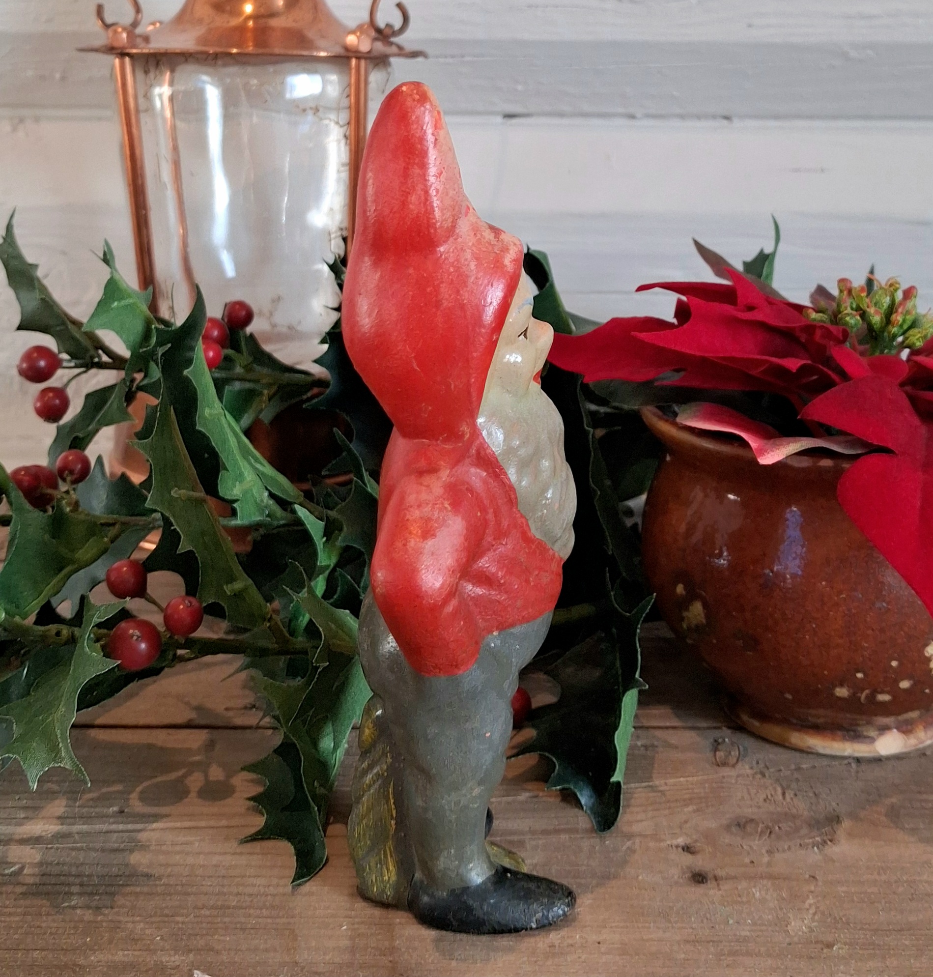 Den sødeste store antikke nisse – patineret med afslidning af farverne, men ingen revner eller afslag – med tekst “GERMANY” bagpå – meget charmerende og dekorativ nisse af ældre dato, som har holdt jul rigtig mange gange –