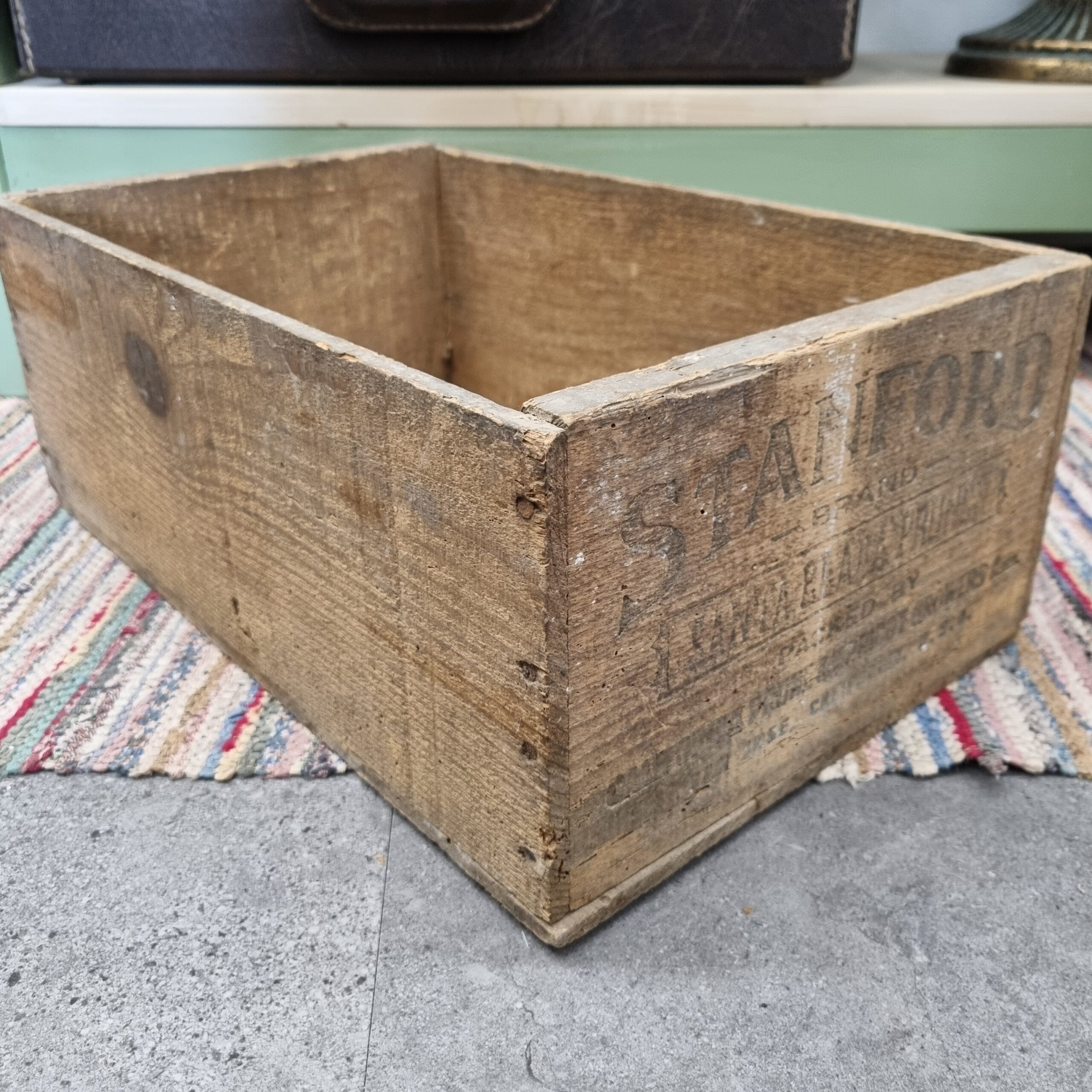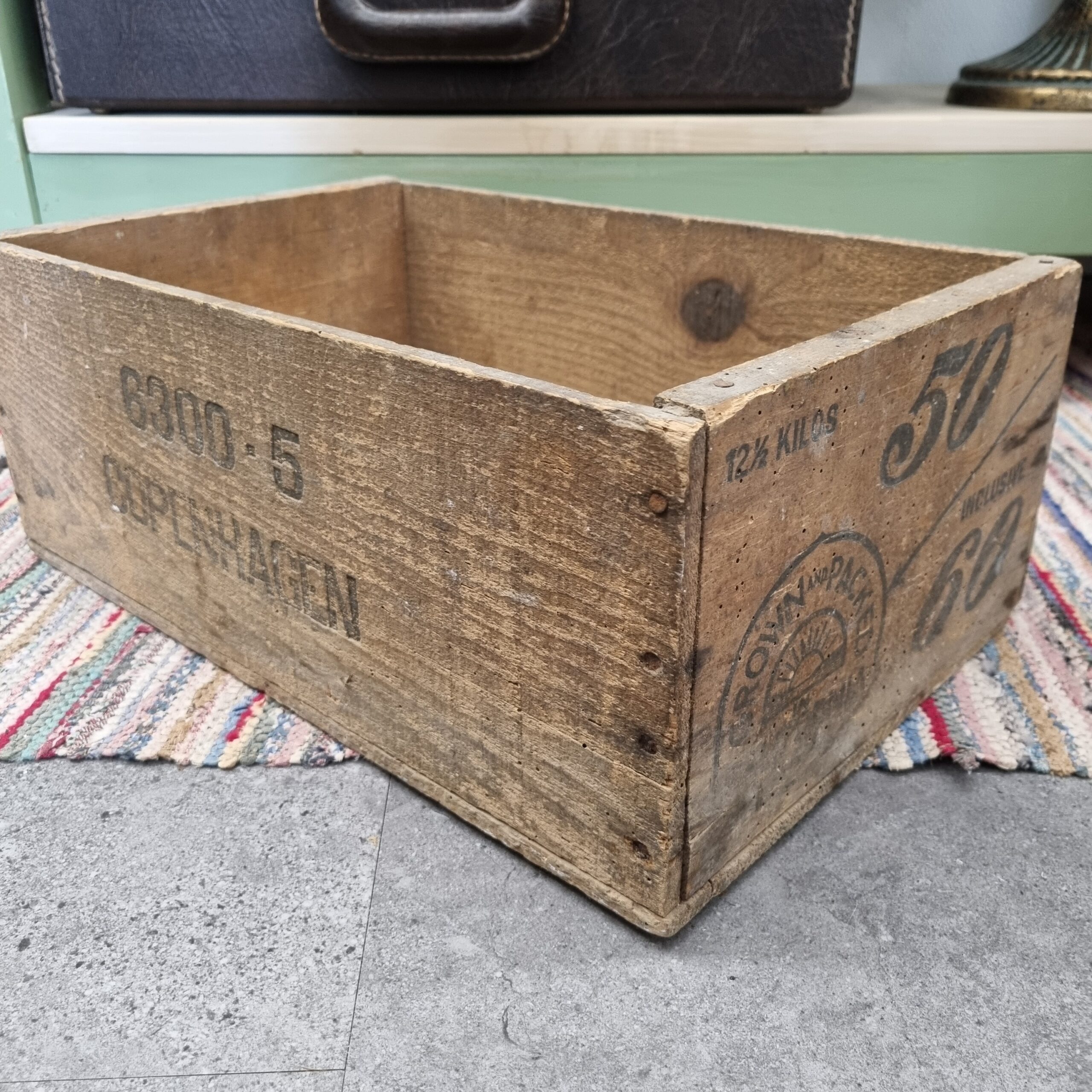 Den flotteste gamle trækasse med logo og fin patina –