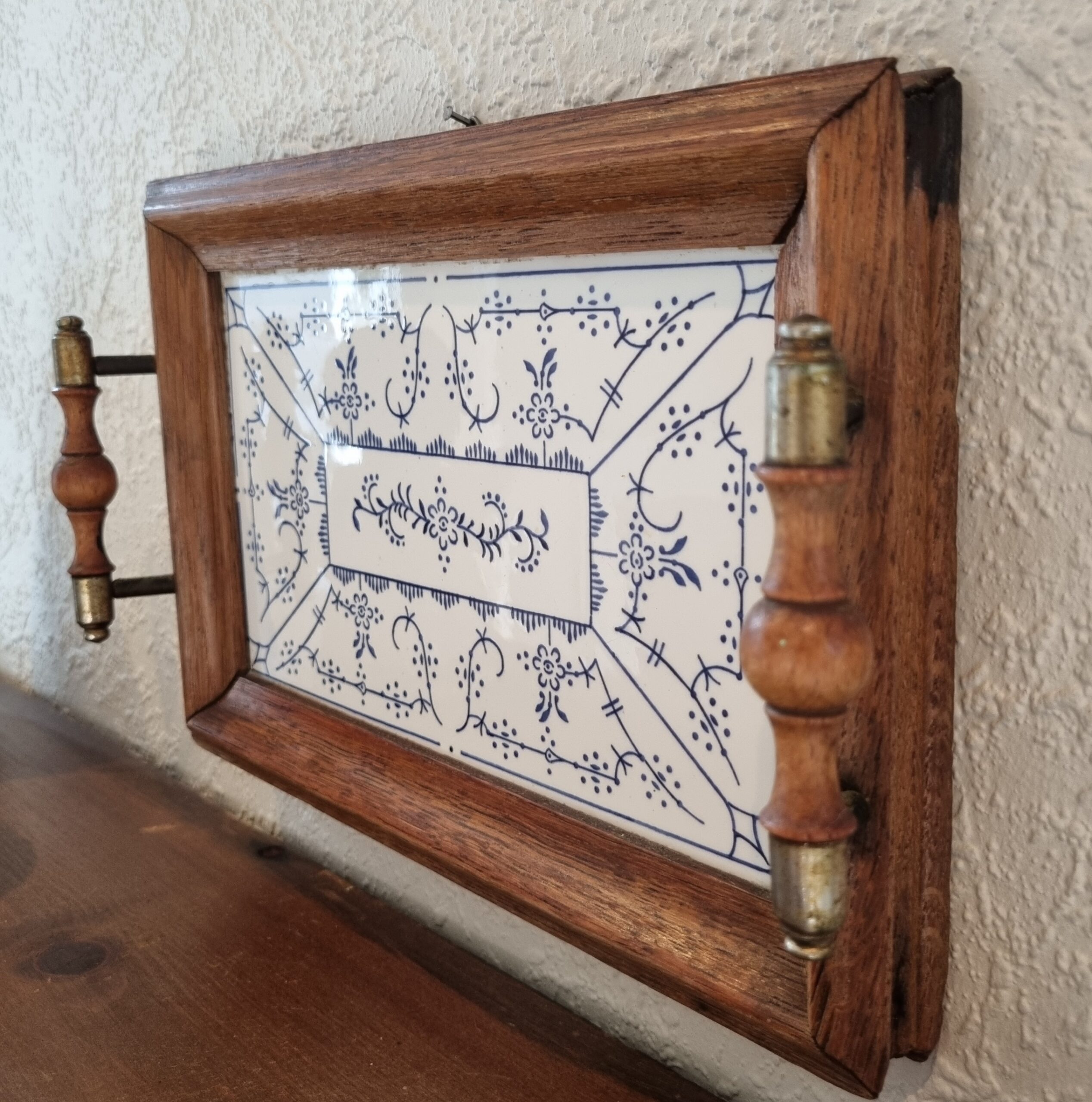 Fin lille Musel porcelæns bakke med smukt motiv i det helt klassiske mønster – gode greb og fin kant rundt – en smuk gammel bakke i velholdt stand med patina på både træ og metaldelen – meget dekorativ til f.eks smykker eller make-up –