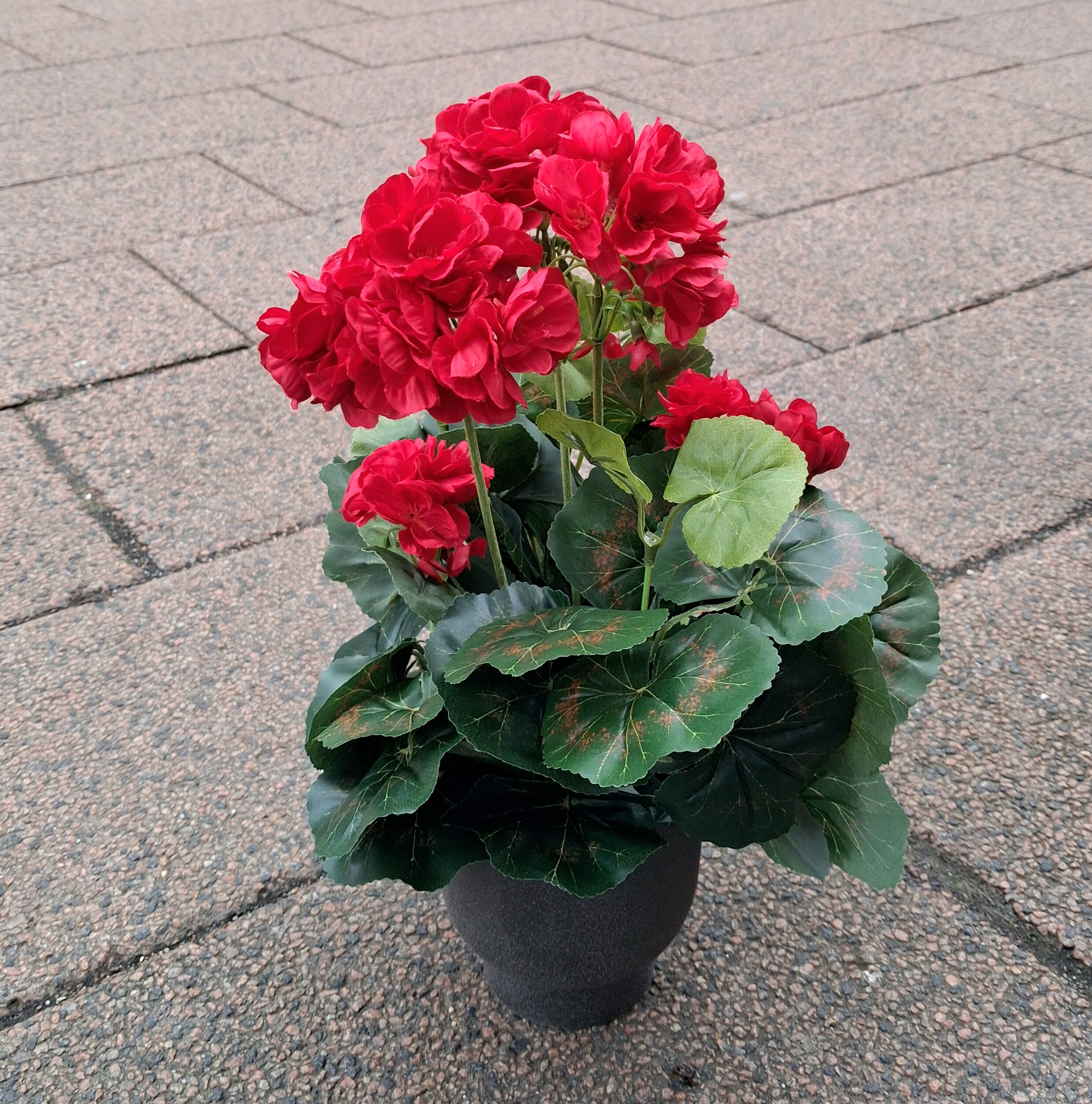 Fin rød Pelargonie i potte – virkelig dekorativ med store flotte blomster hoveder og små knopper – en flot kunstig potteplante, som står støbt i en plastpotte (den viste skjuler medfølger ikke)