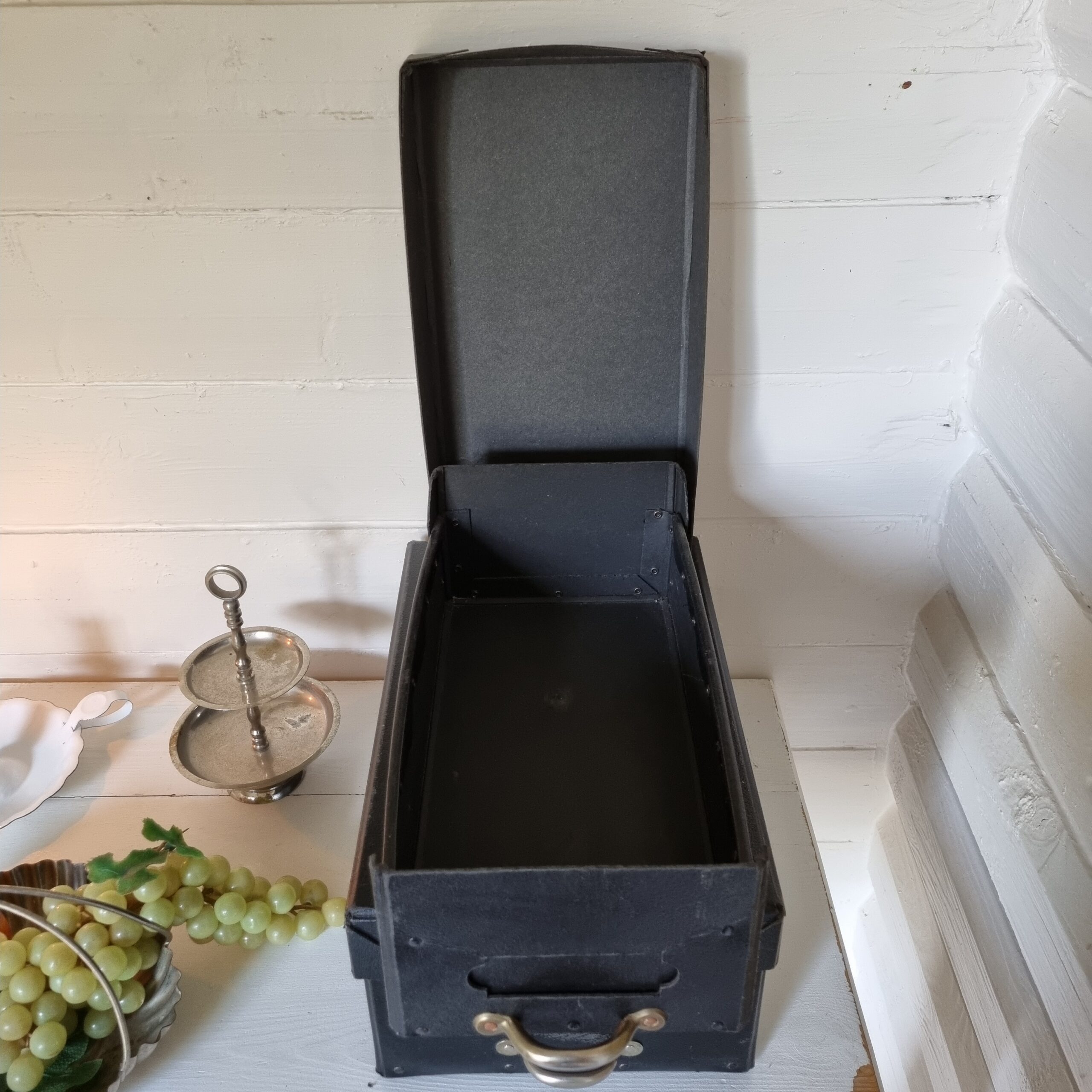 Praktisk og dekorativ gammel arkiv kasse i kraftigt pap – god til opbevaring og flot på skrivebordet !