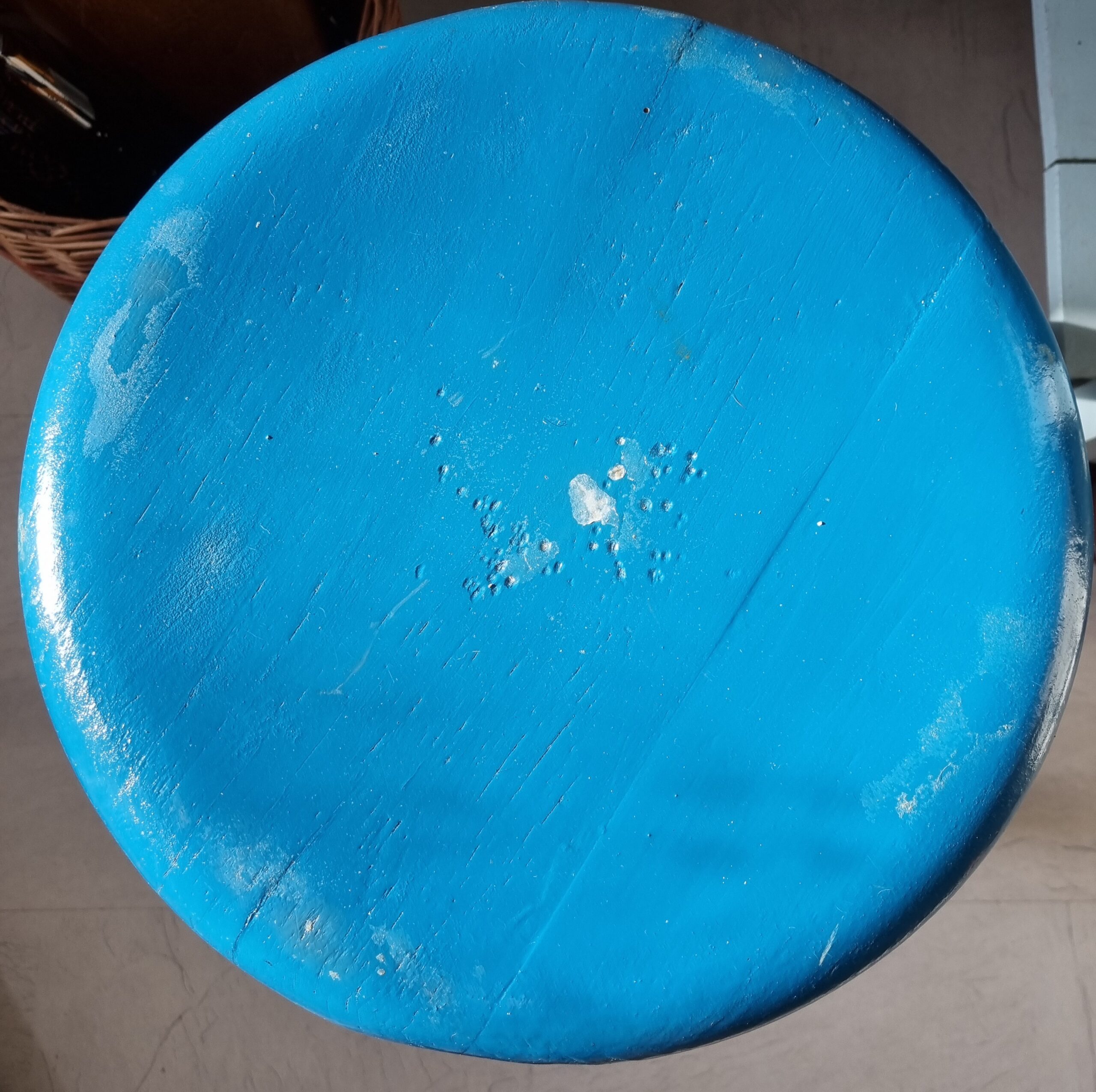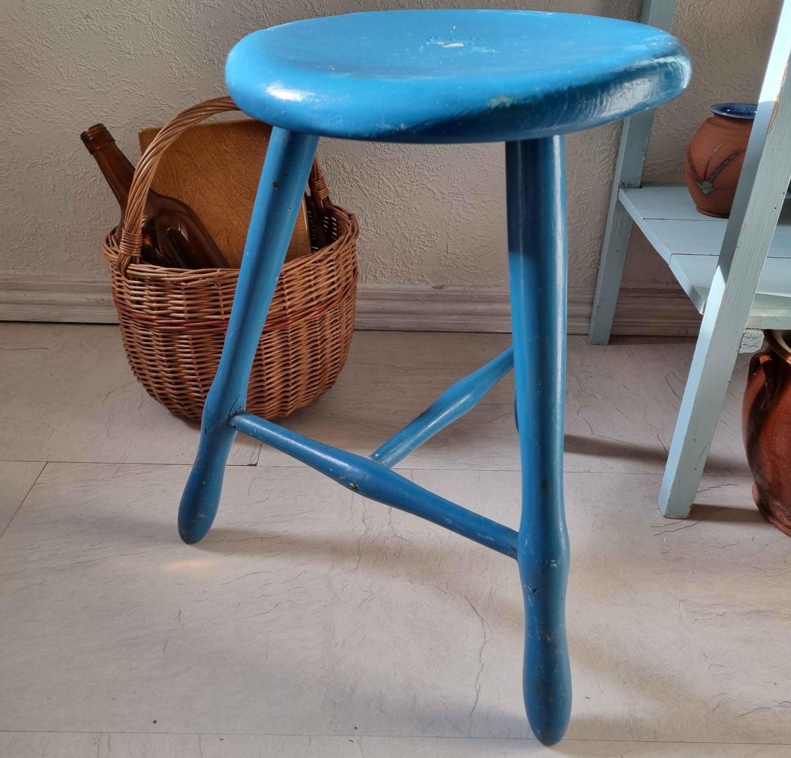 Flot gammel rund skammel – fin køkkenblå med let patina og afskalning, men i hel og solid stand – en skammel, som f.eks også er velegnet som lille ekstra bord eller natbord –
