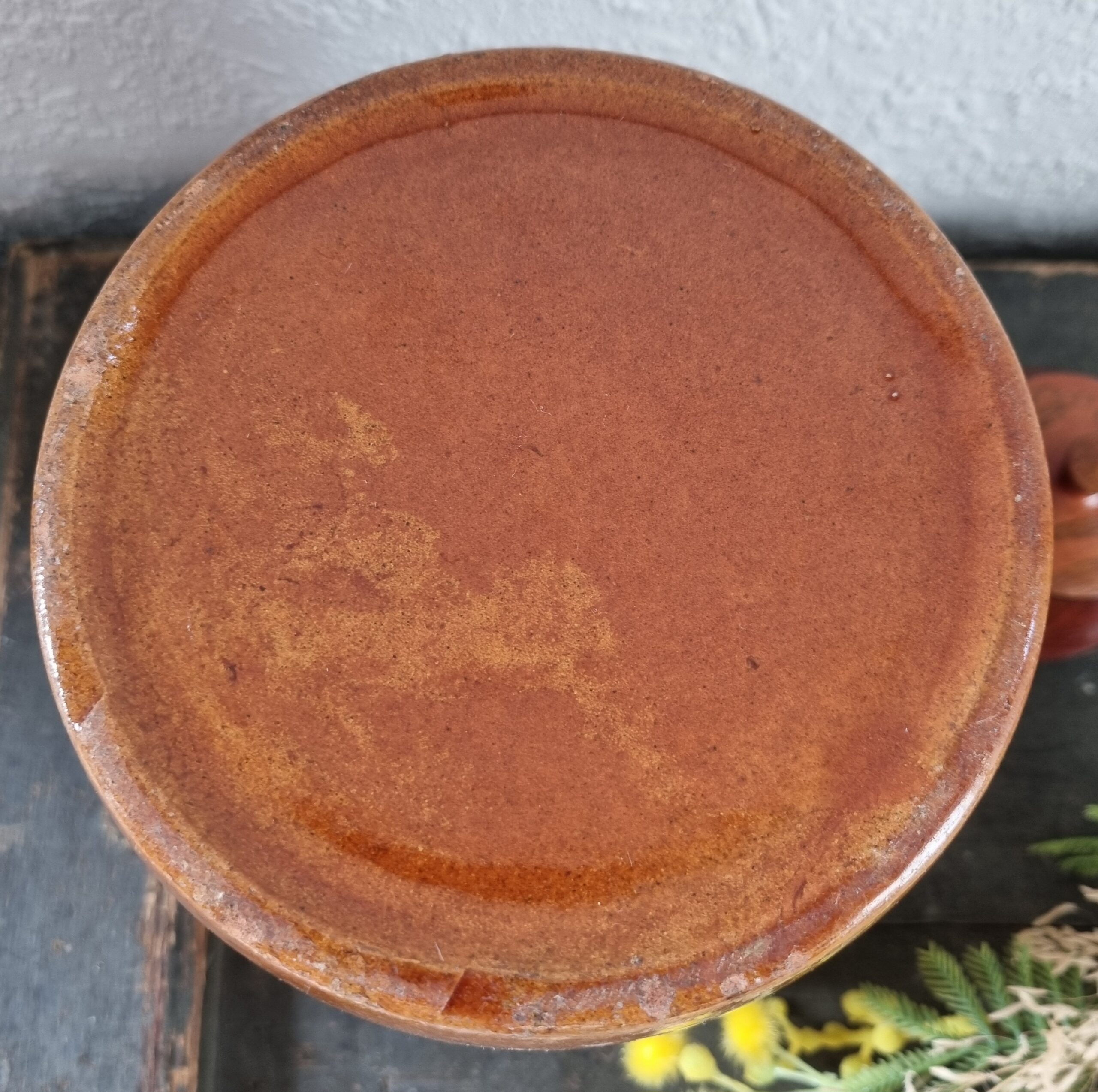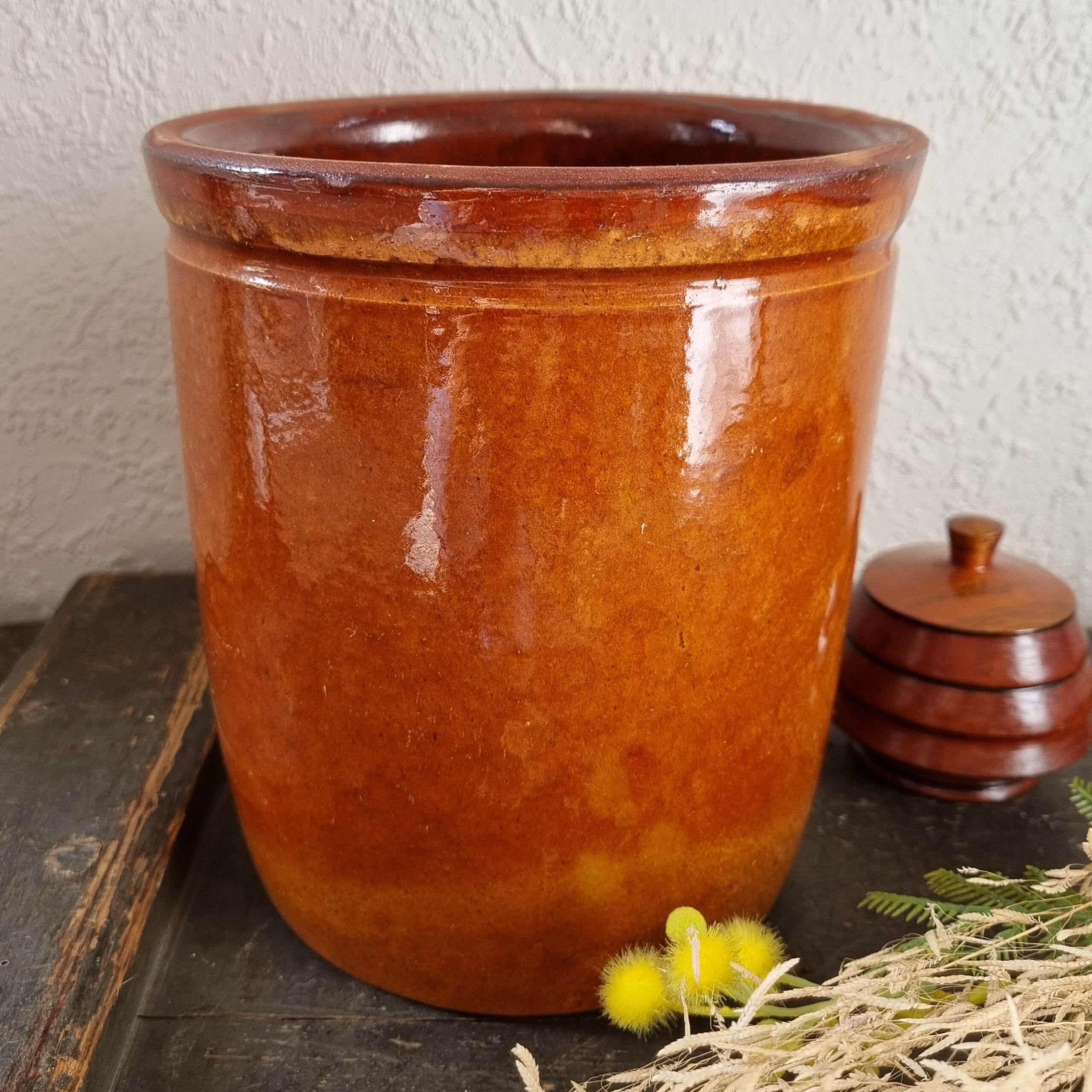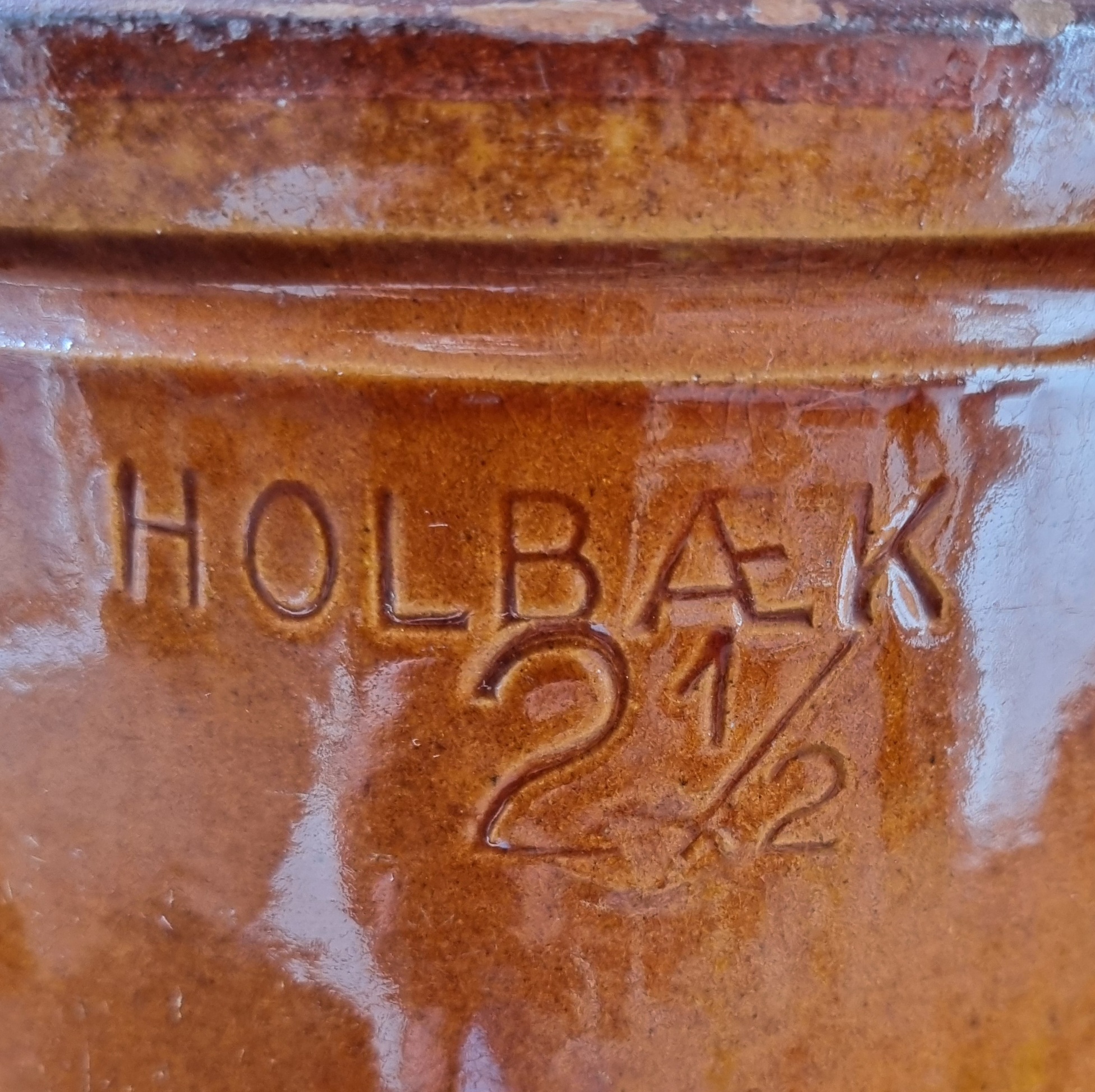 Flot Holbæk syltekrukke 2½ l. i fin stand og med rigtig smuk gyldenbrun glasur både indvendigt og udvendigt – med små brugsspor, men uden skår eller revner – smuk at have stående fremme til f.eks årstidens blomster og grene eller til køkkenredskaber –