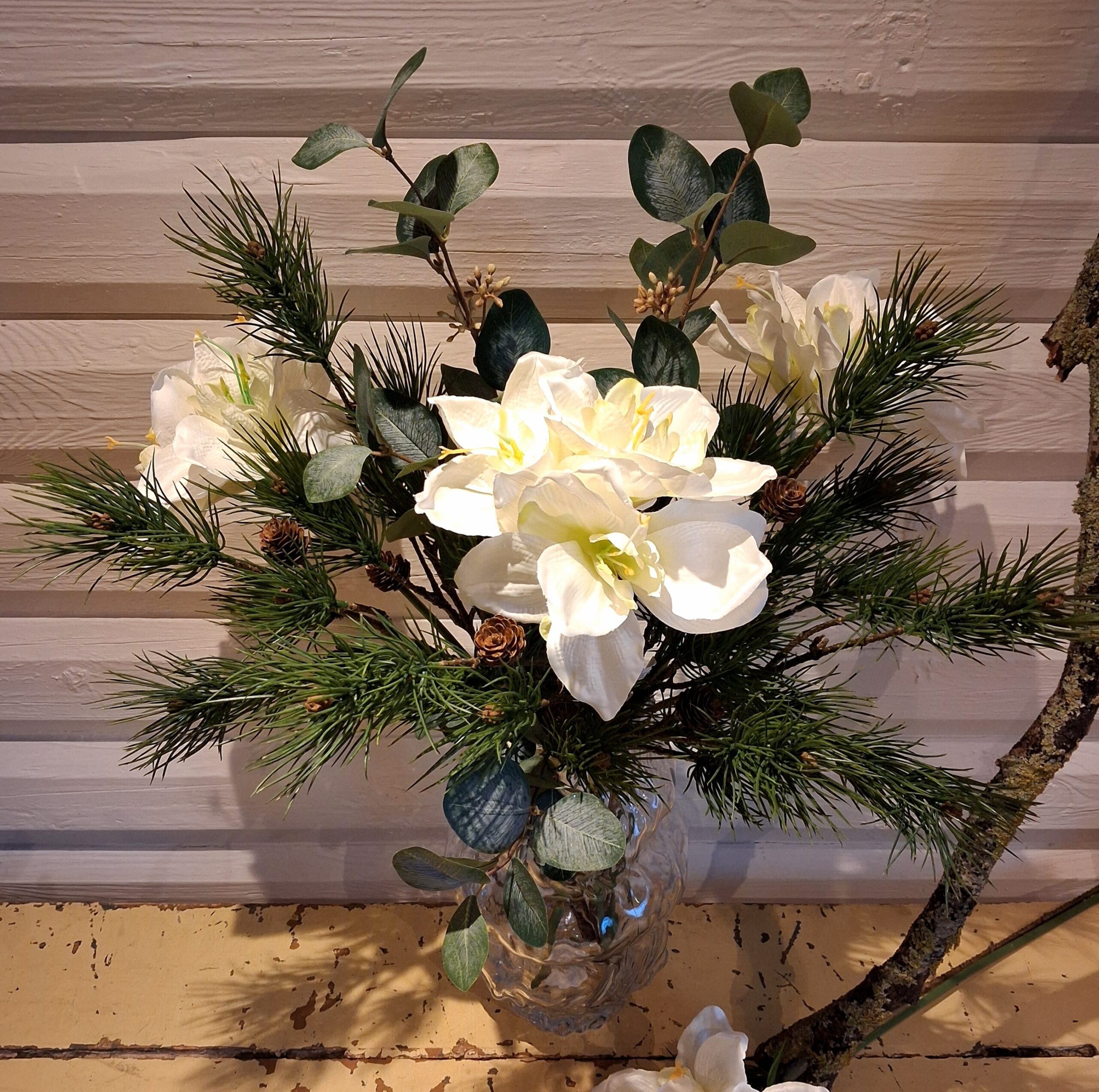 Flot hvid Amaryllis stilk med stort fyldigt blomsterhoved – hele 3 store blomsterhoveder på hver – en meget dekorativ og naturtro kunstig blomst, som gør sig godt både i en buket eller alene i vasen – kaldes også “De 4 verdenshjørner” – med bøjelig stilk, så den kan tilpasses dine forskellige vaser –