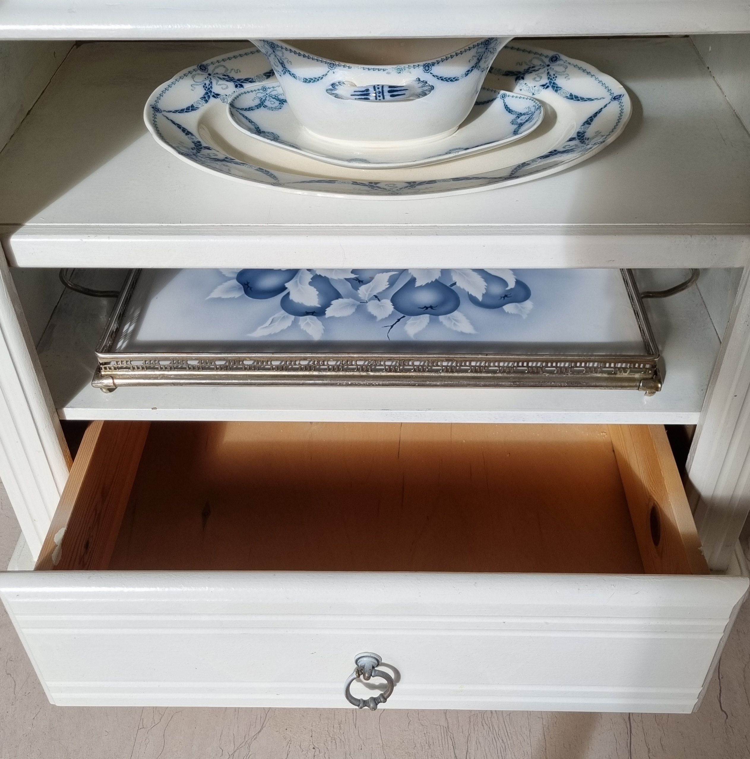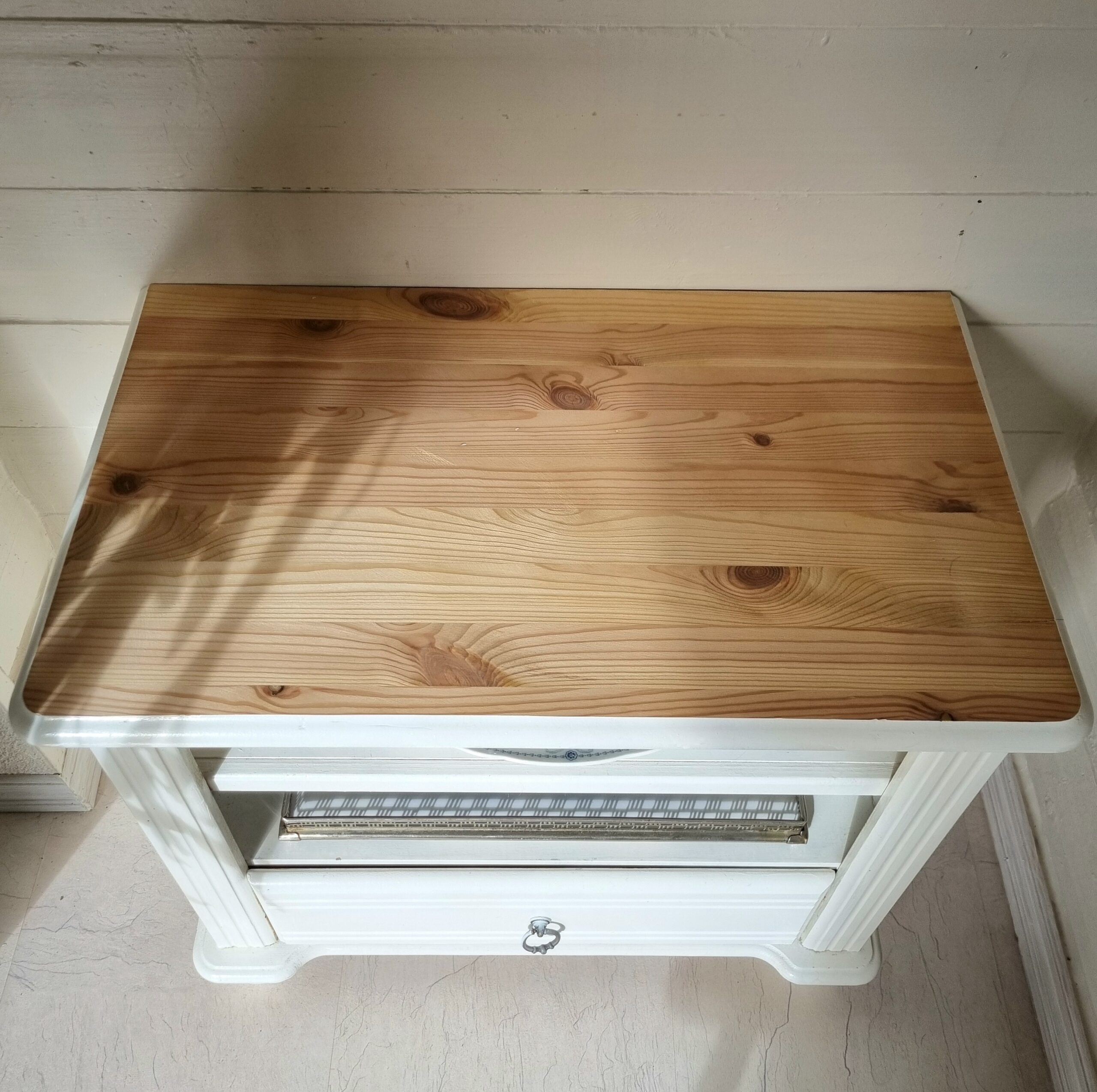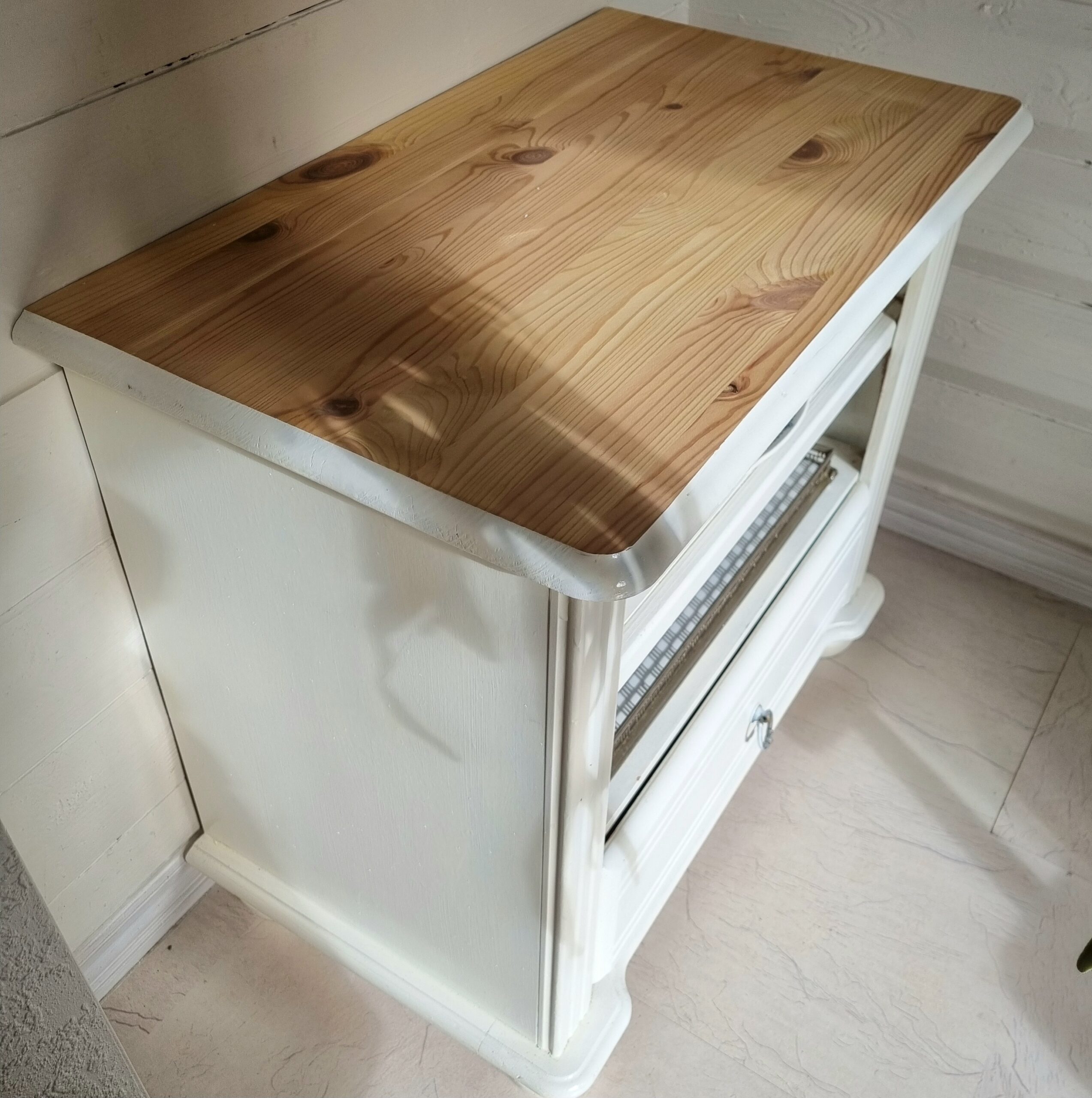 Flot lille hvid reol – også velgenet som T.V.- bænk – flot og praktisk, lavet i kraftigt træ og er i rigtig fin stand med huller til ledningerne i bagbeklædningen – slebet og sæbebehandlet topplade –
