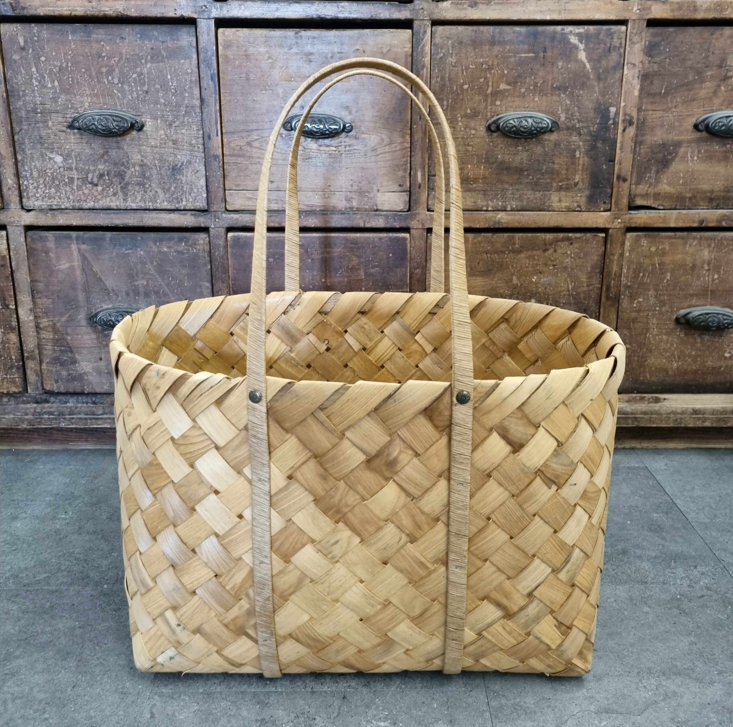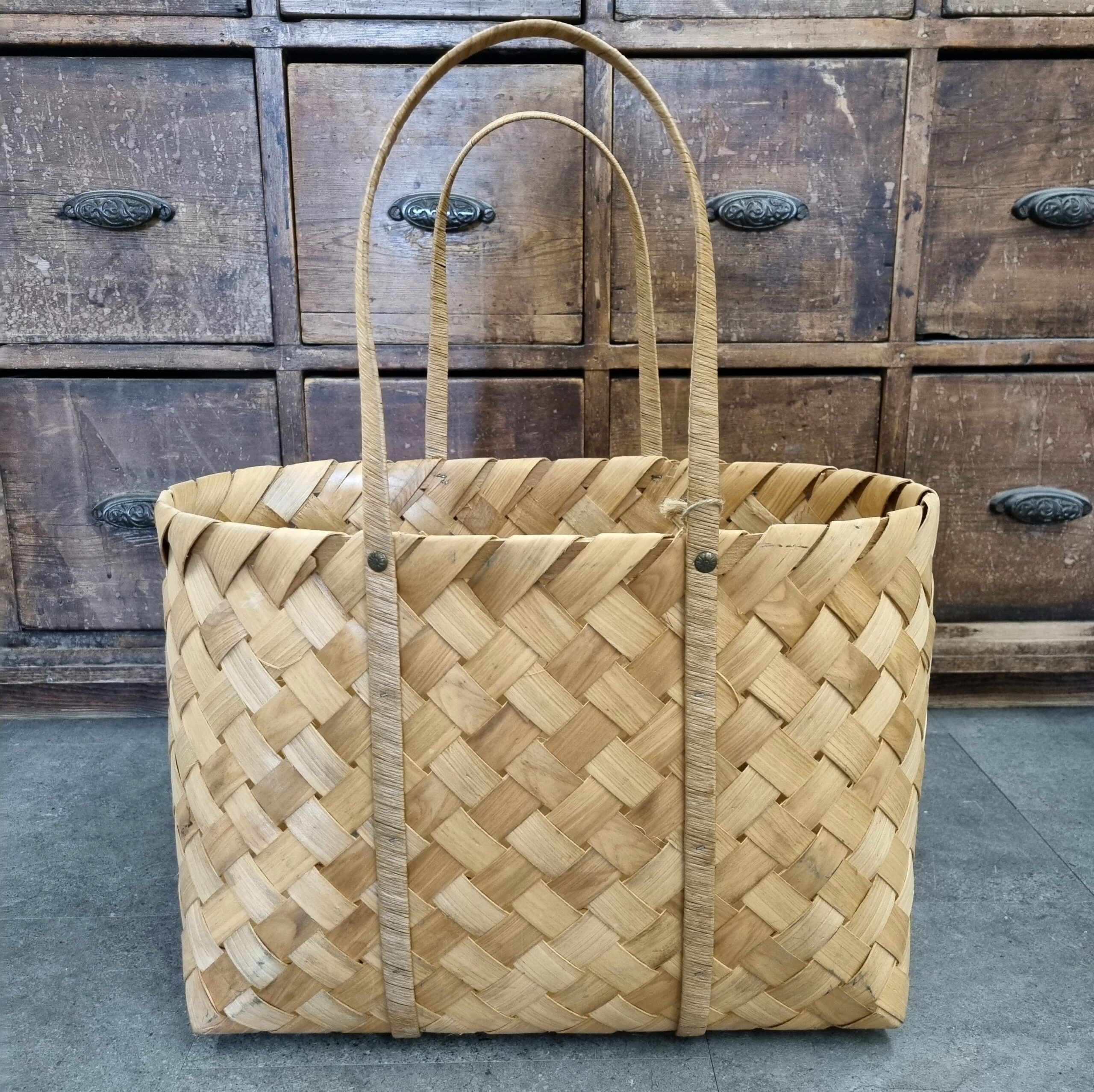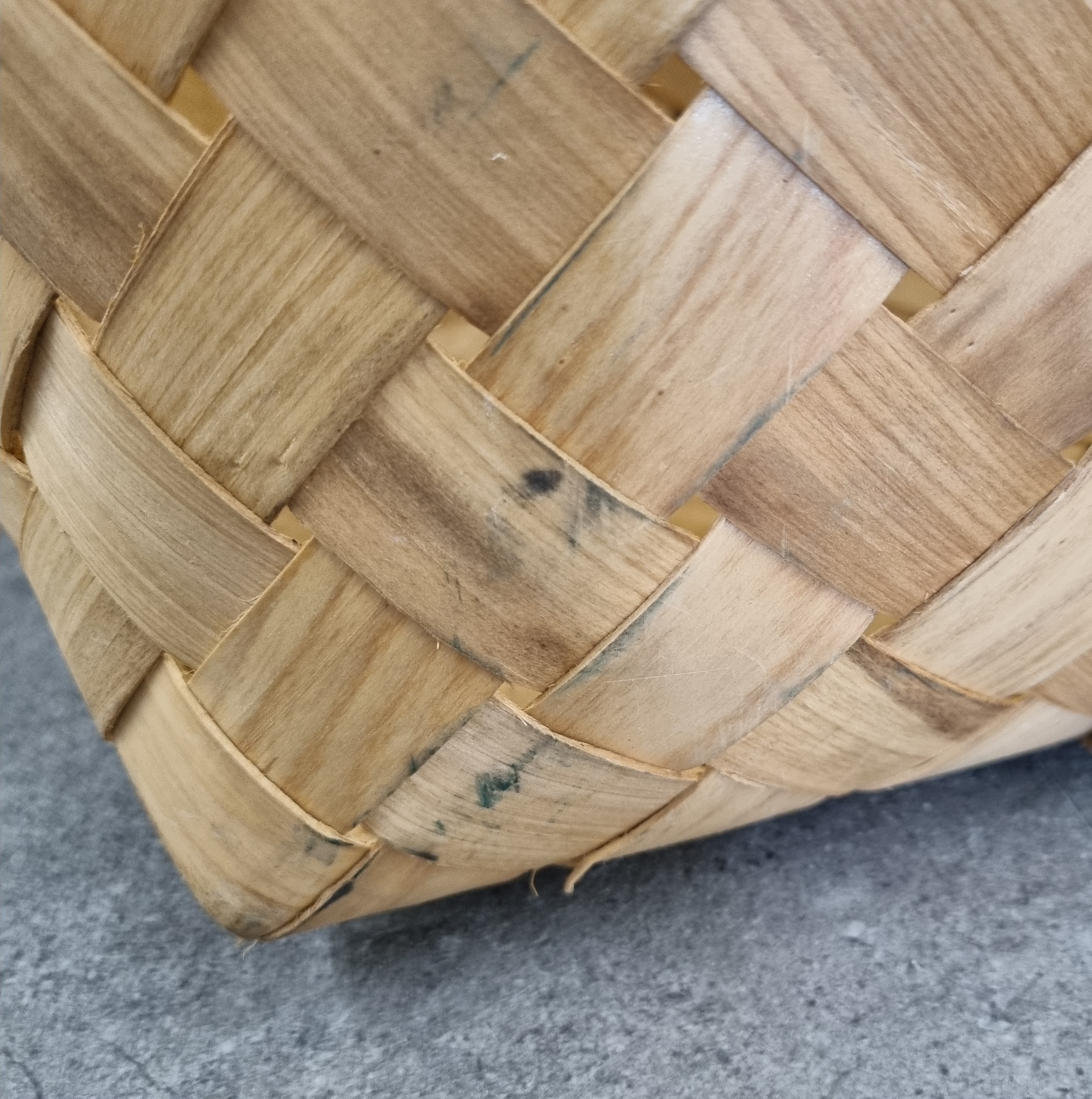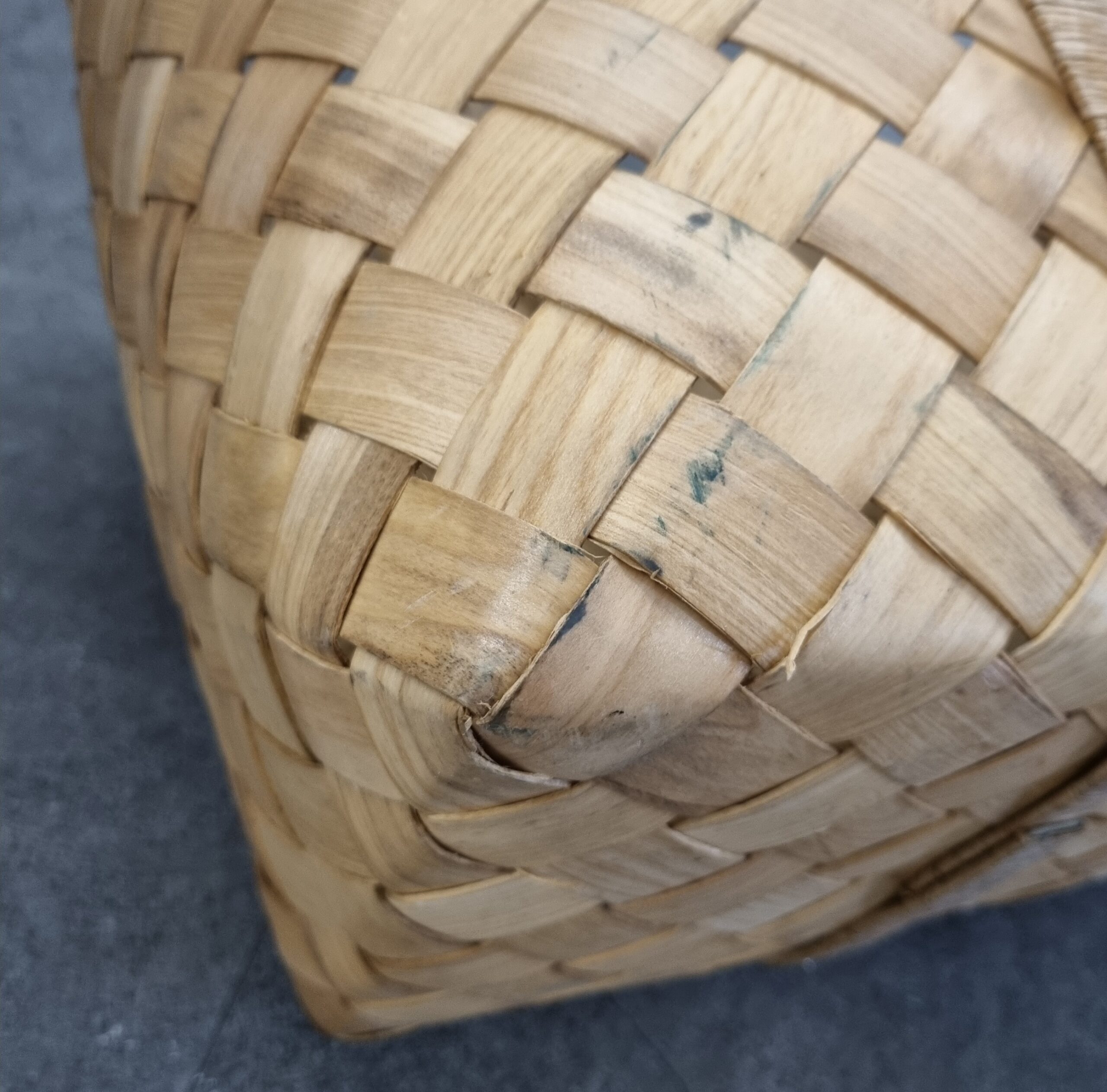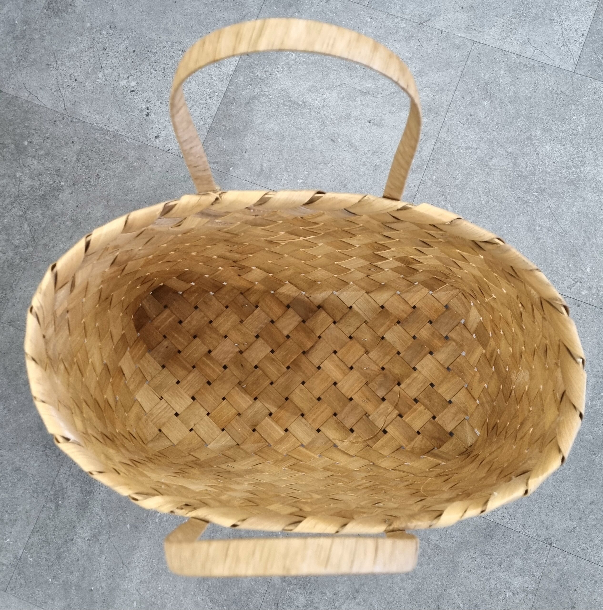 Flot norsk håndlavet spånkurv med hanke i let træ – kurven har kun været brugt til udstilling og har fået lidt (kosmetiske) brugsspor, derfor nedsat – fin og dekorativ til både dagligt brug og opbevaring –