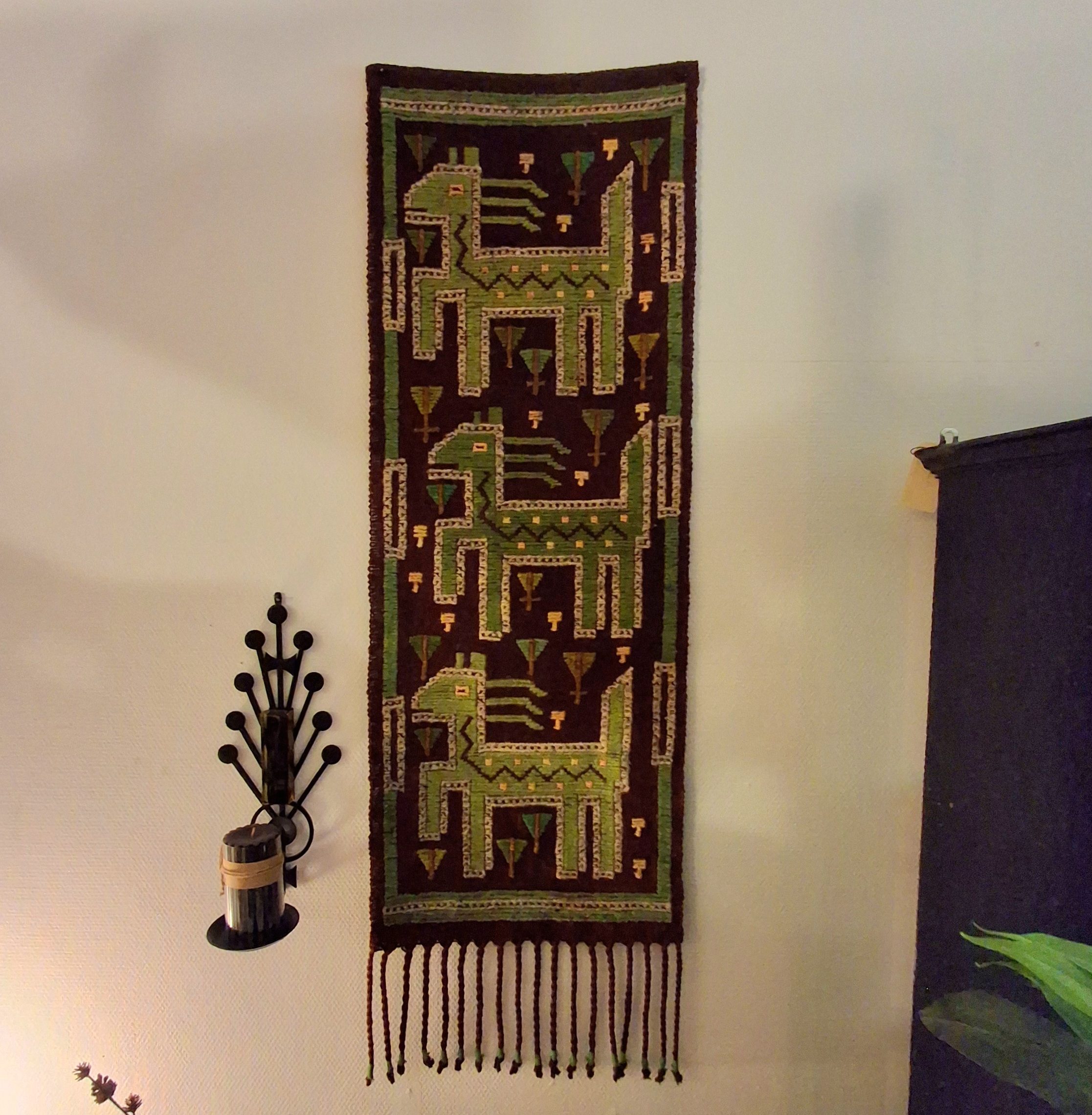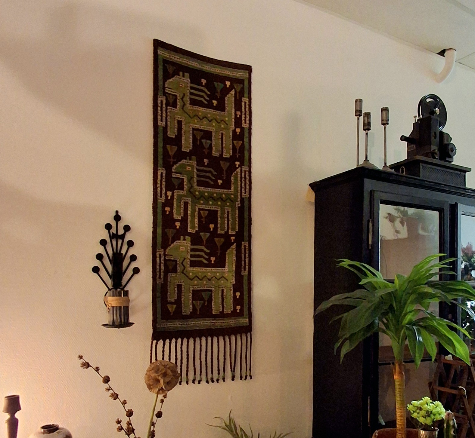 Flot retro vægtæppe i smukke farver med frynser og motiv i oliven og brune nuancer – virkelig dekorativ retro vægdekoration – vægtæppet er flot, velholdt og i sin bedste stand –