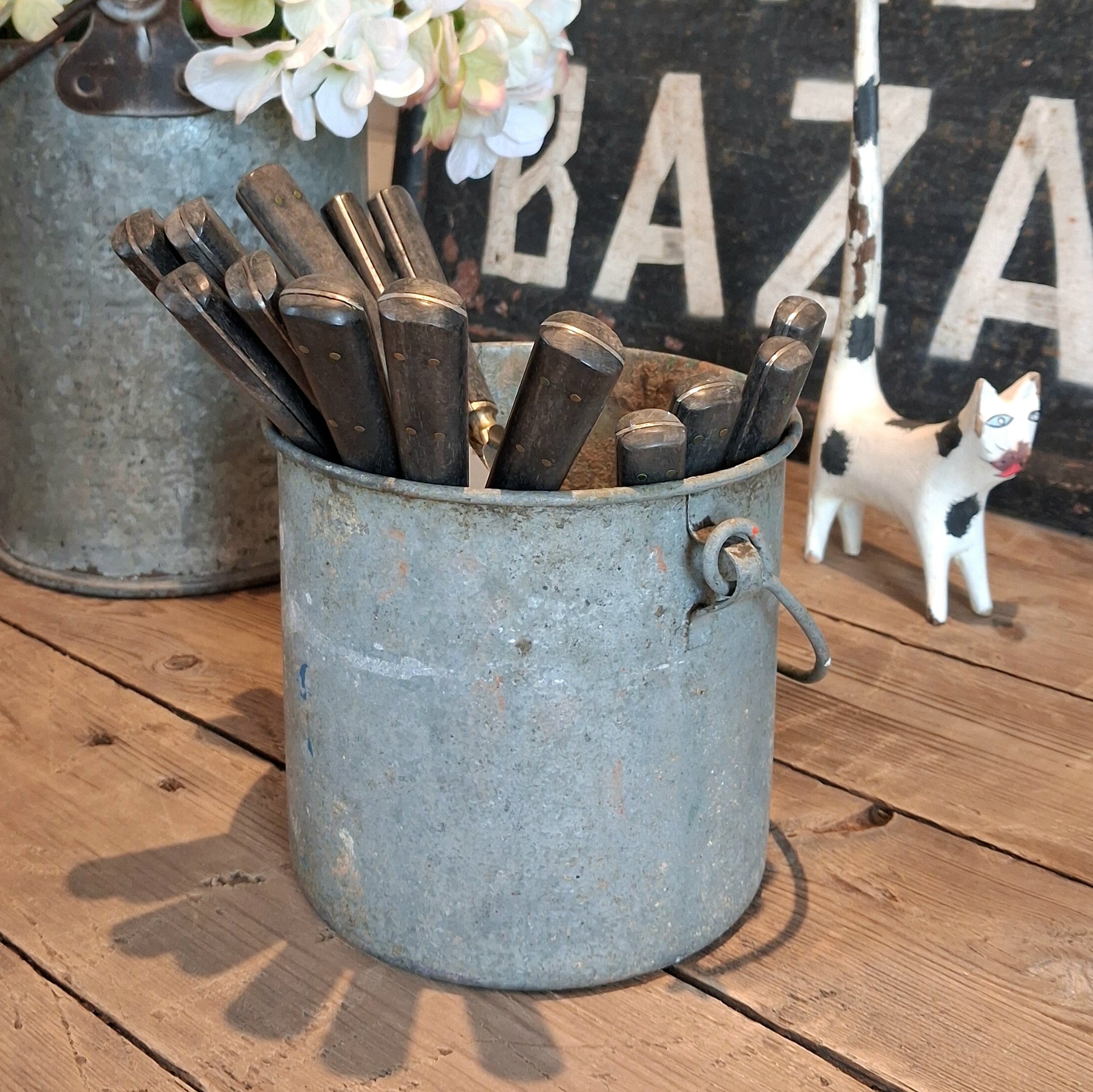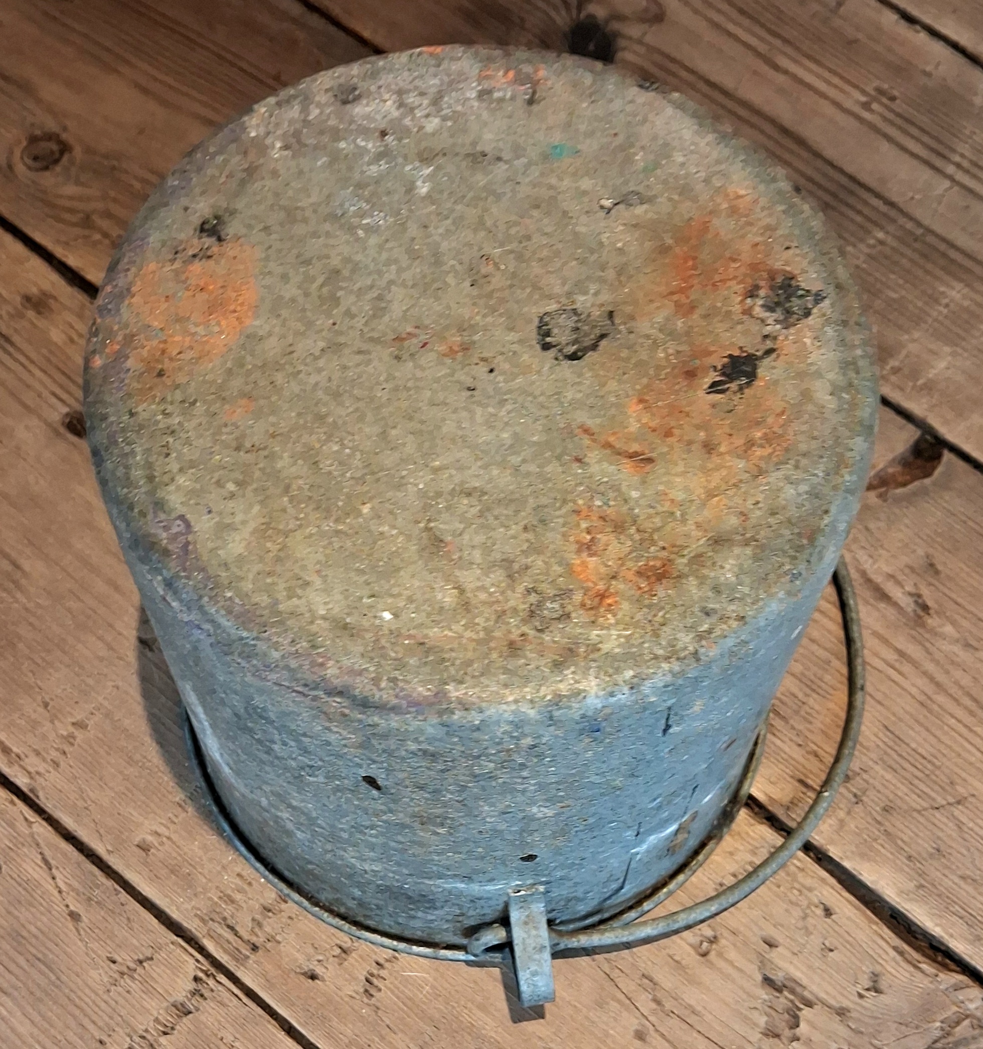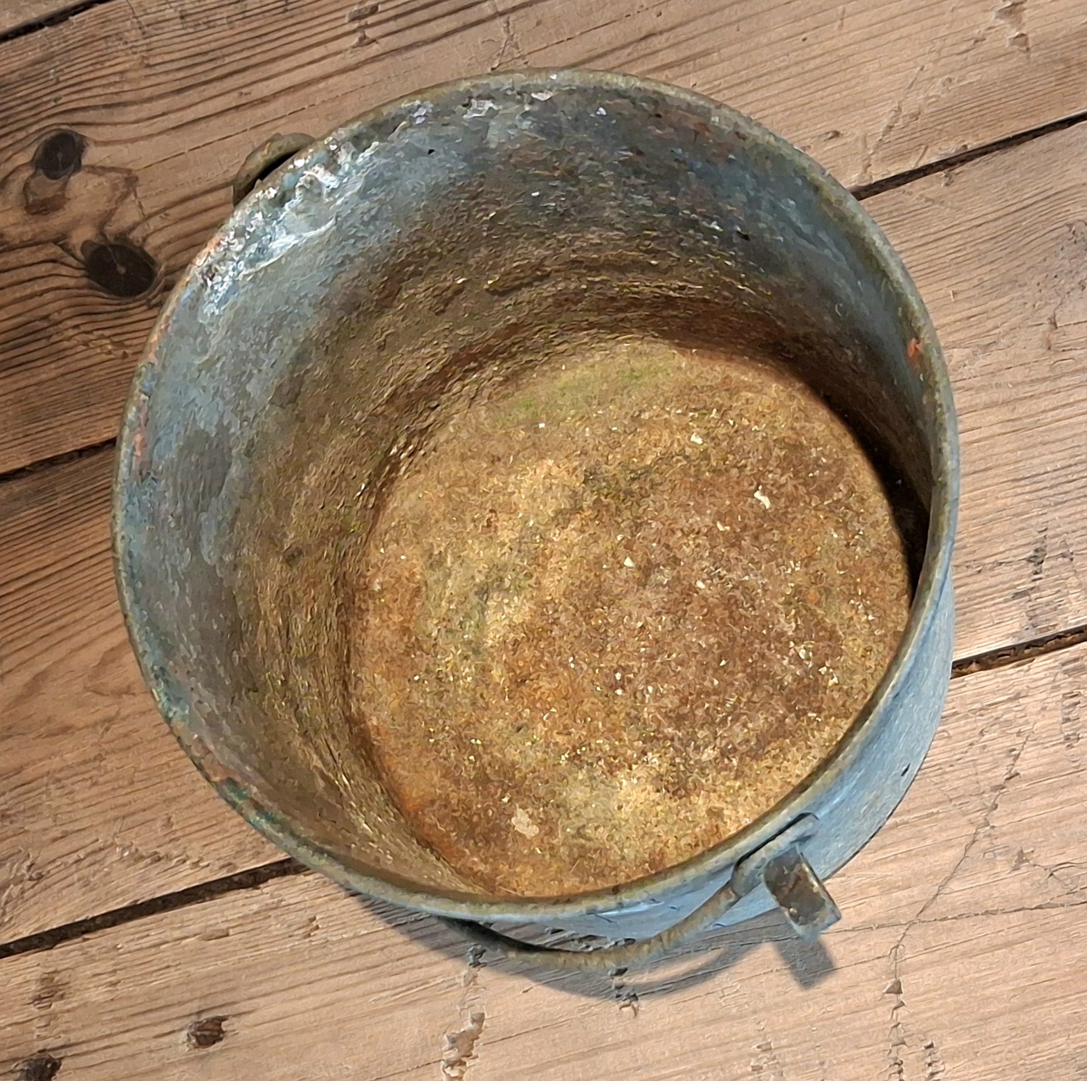 Flot rustik gammel spand med hank – flot patineret og i robust stand, med mange anvendelses muligheder f.eks til at plante direkte i, som vase eller som flot potteskjuler, ude som inde – med malerrester og brugsspor –