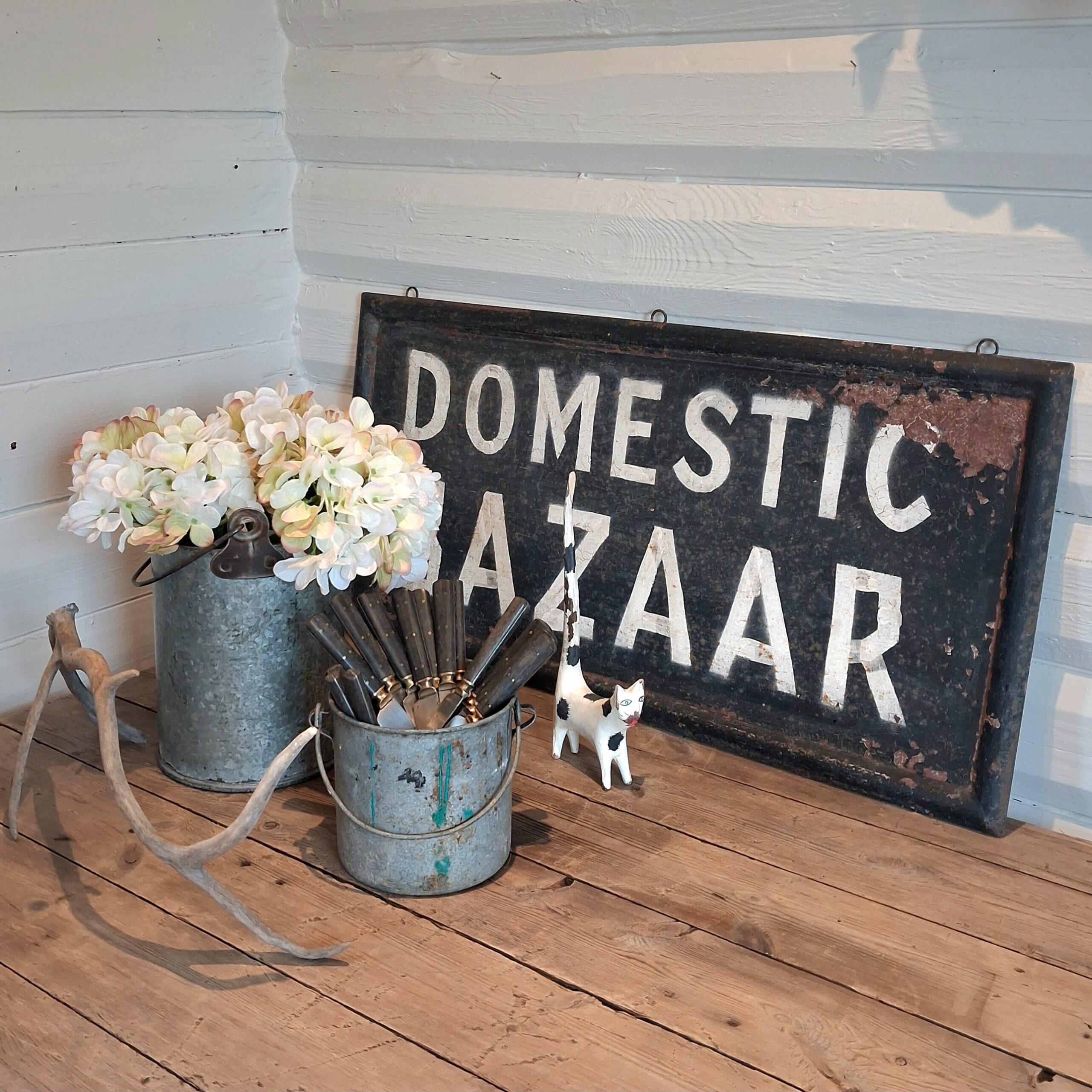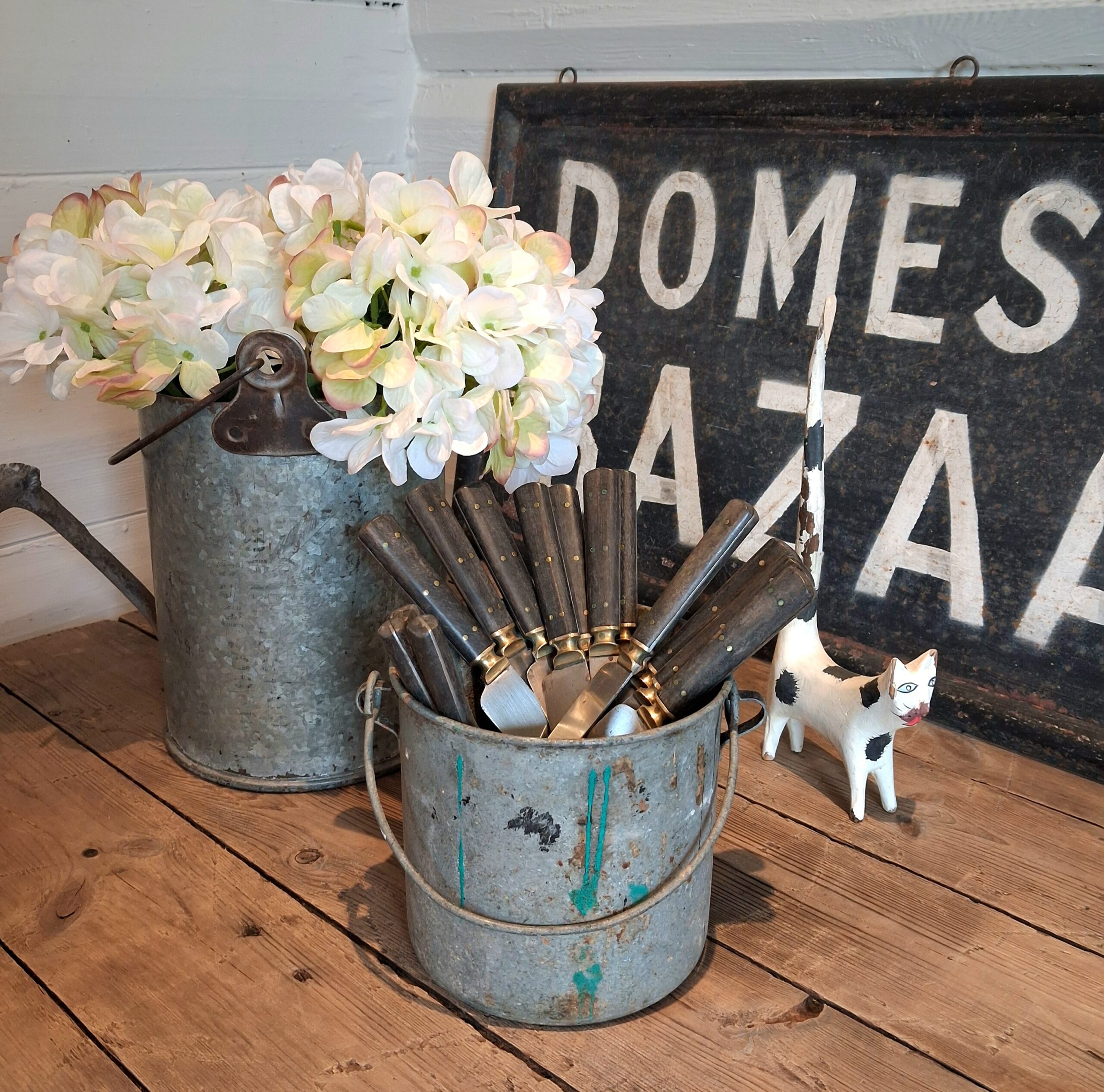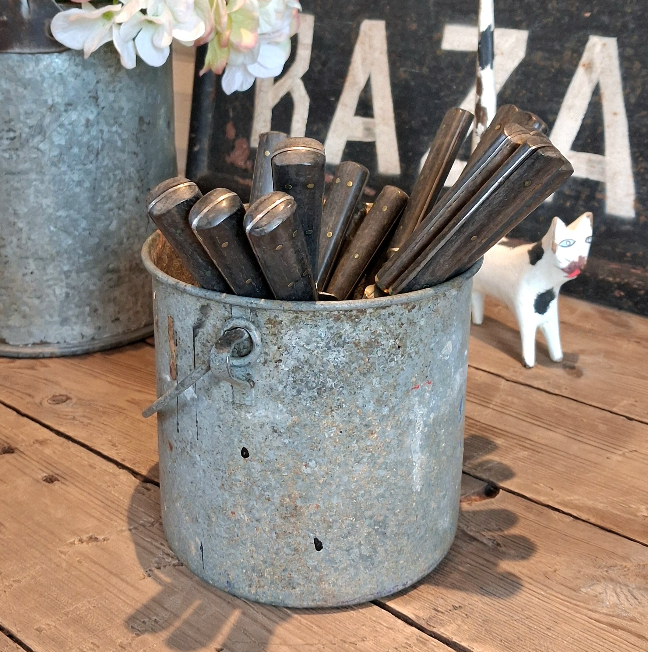 Flot rustik gammel spand med hank – flot patineret og i robust stand, med mange anvendelses muligheder f.eks til at plante direkte i, som vase eller som flot potteskjuler, ude som inde – med malerrester og brugsspor –