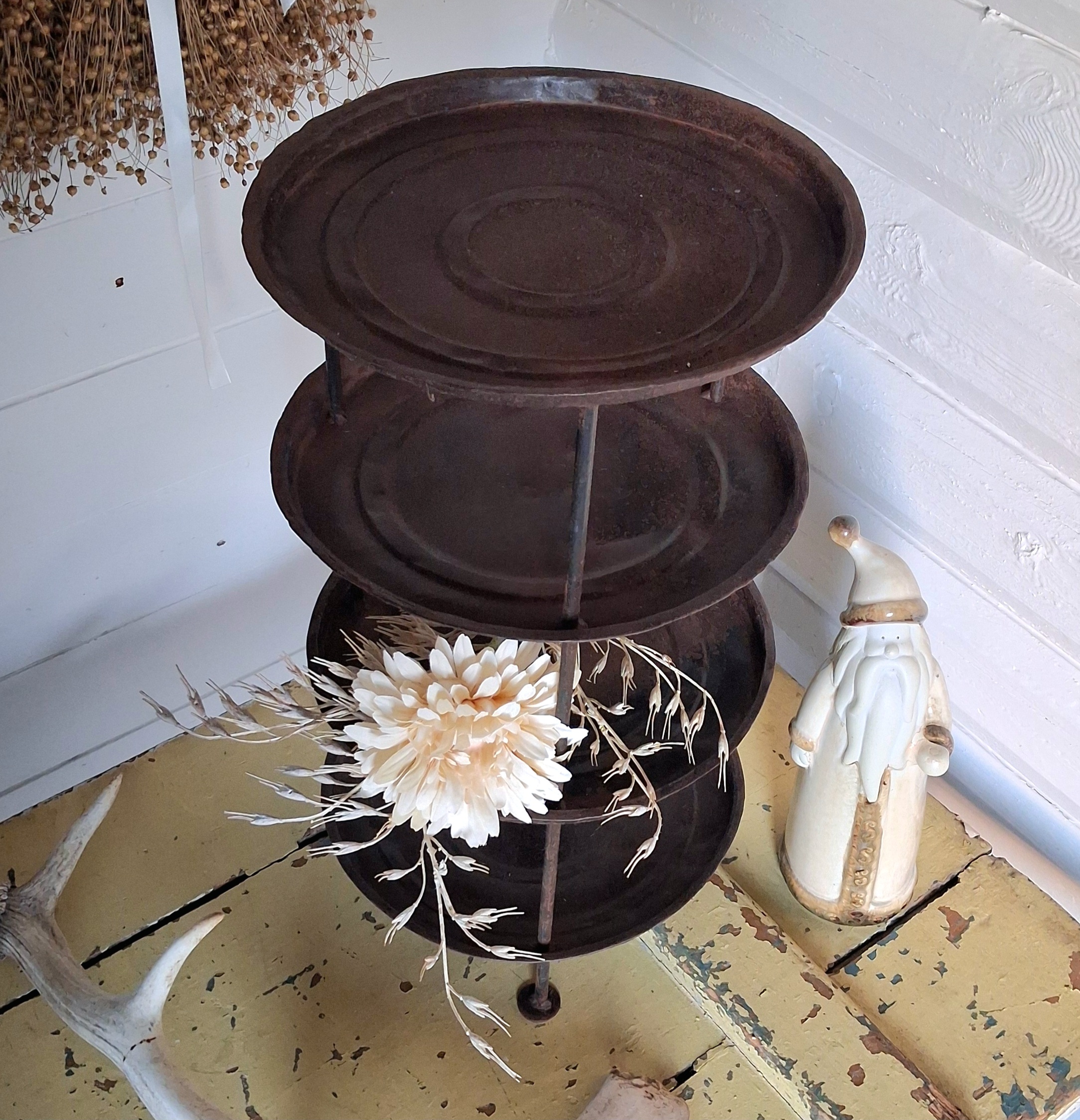 Flot rustik opsats – recycled i 4 etager – velegnet til f.eks frugt og grønt eller årstidens dekorationer – opsatsen er lavet af genbrugsmetal med 4 bakker sat sammen og på små ben – med flot patinerings effekt –