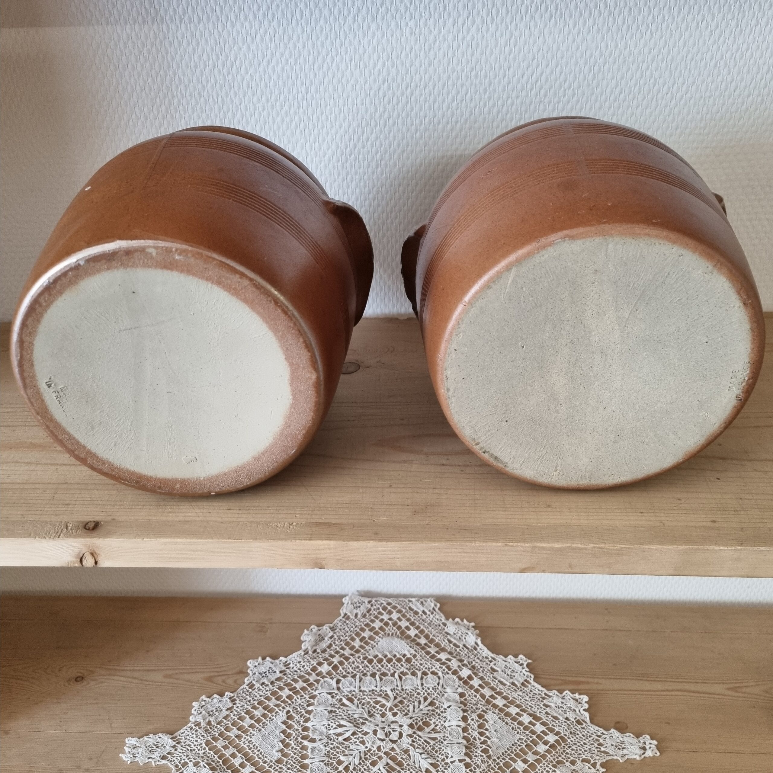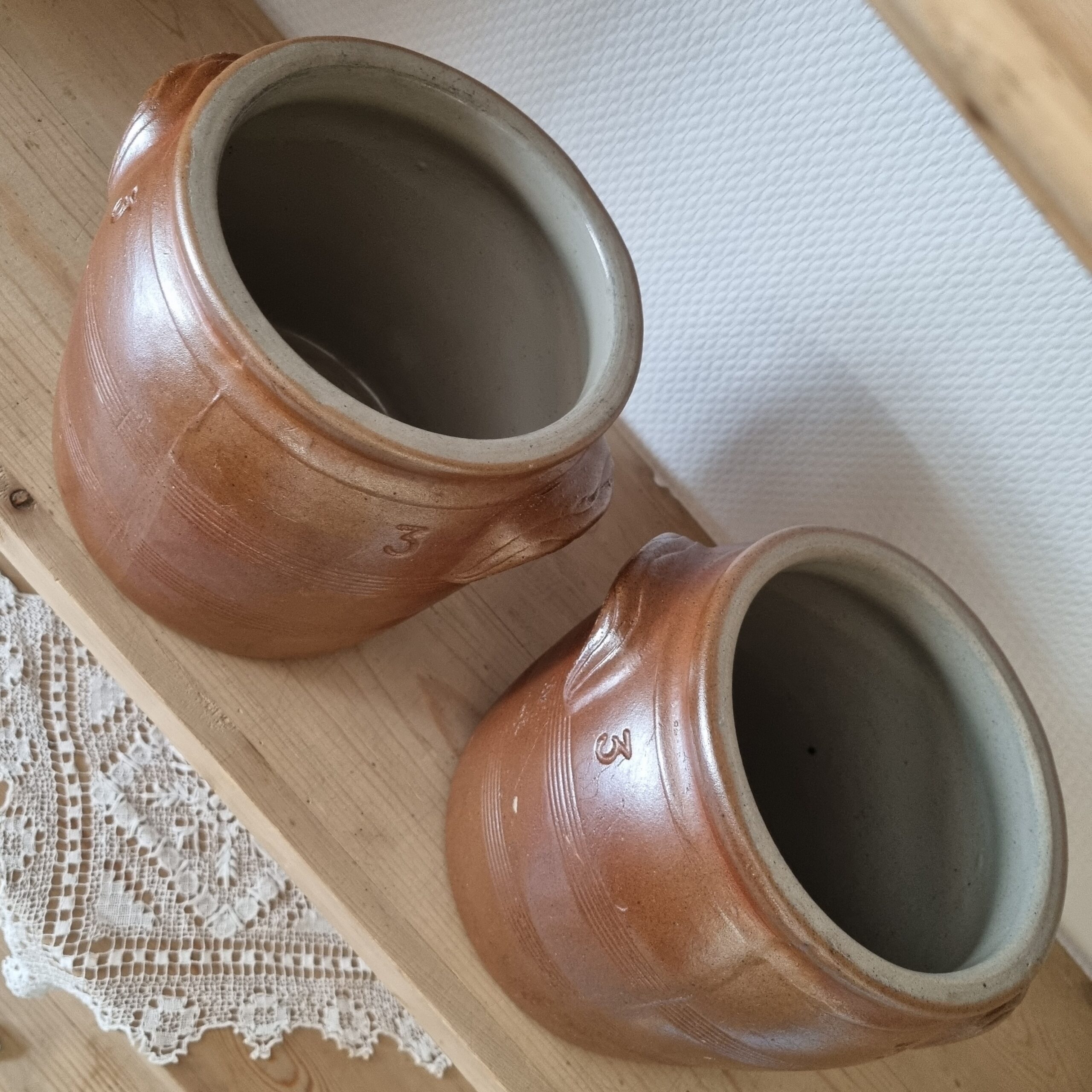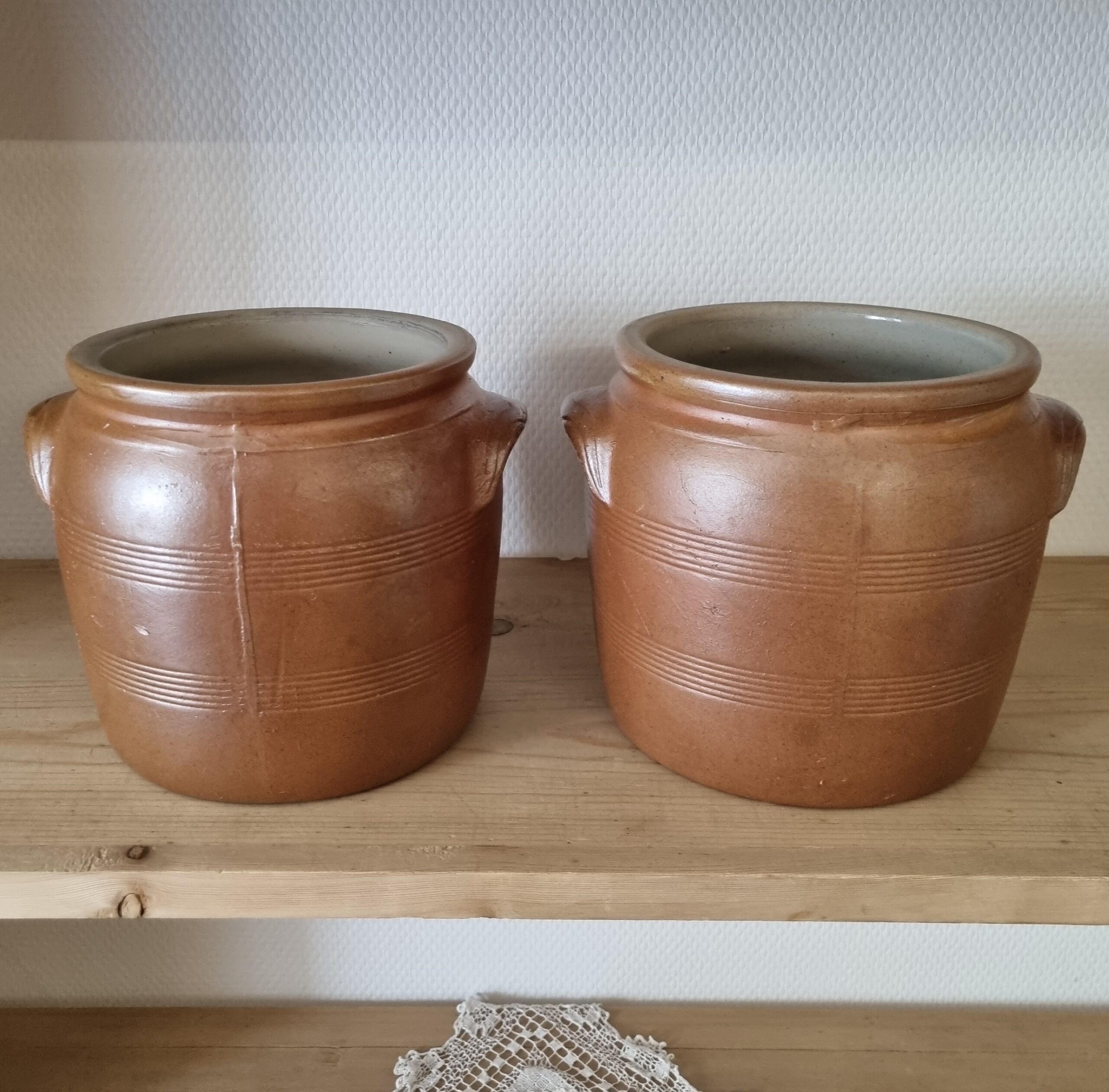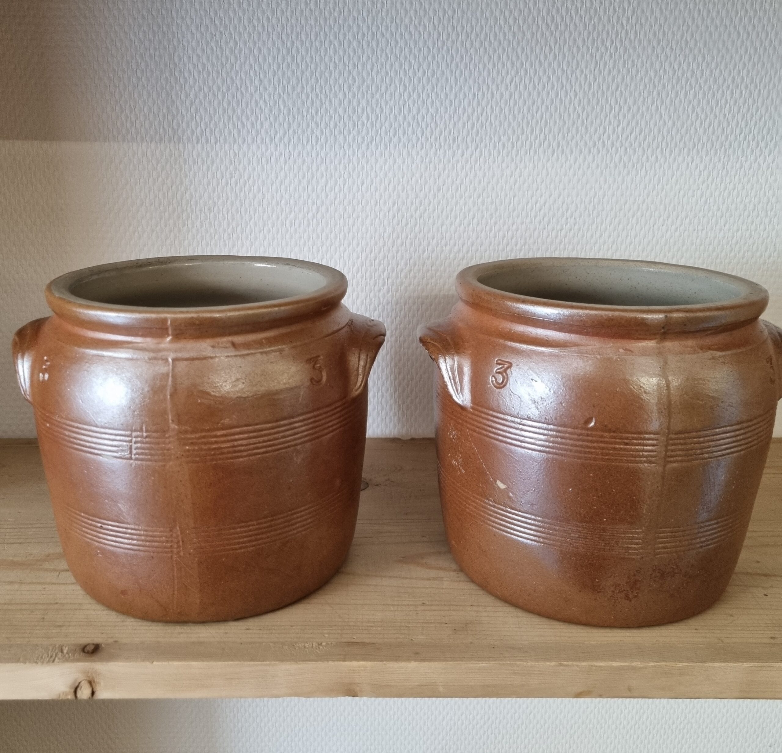 Fransk sylte krukke med ører – i smuk glasur – rustik syltekrukke med fin glasur både indvendigt og udvendigt – med små brugsspor, men uden skår eller revner – flot at have stående fremme til f.eks årstidens blomster og grene –
