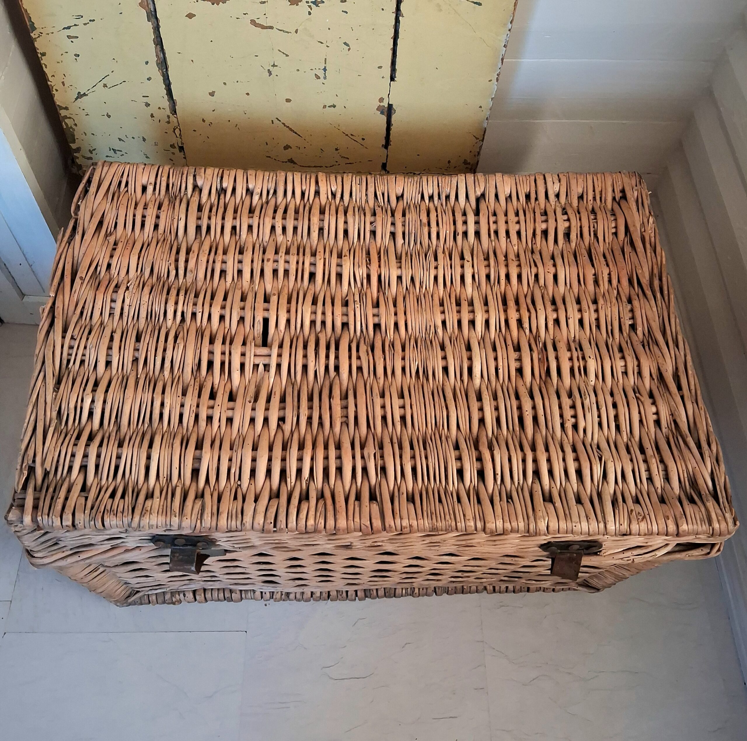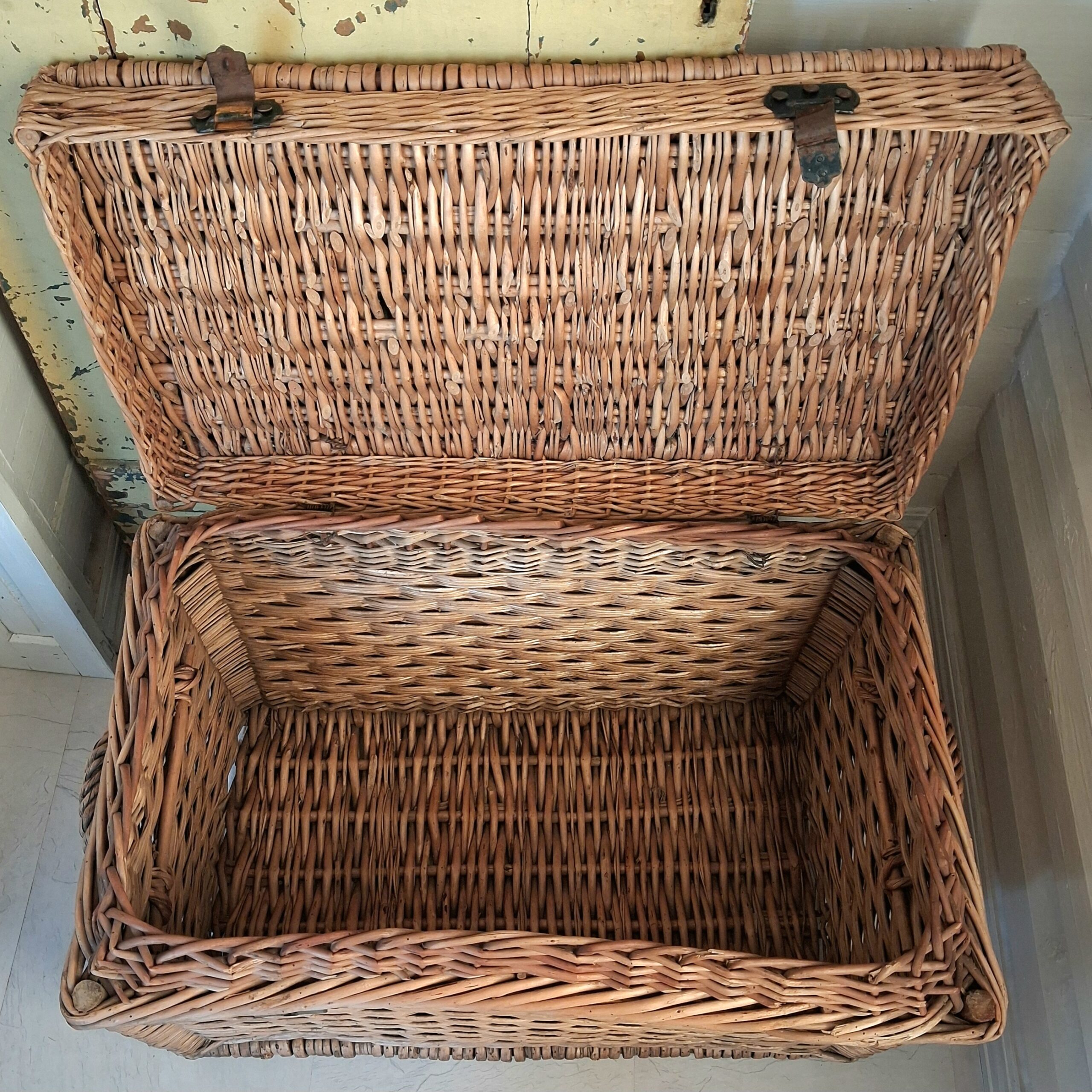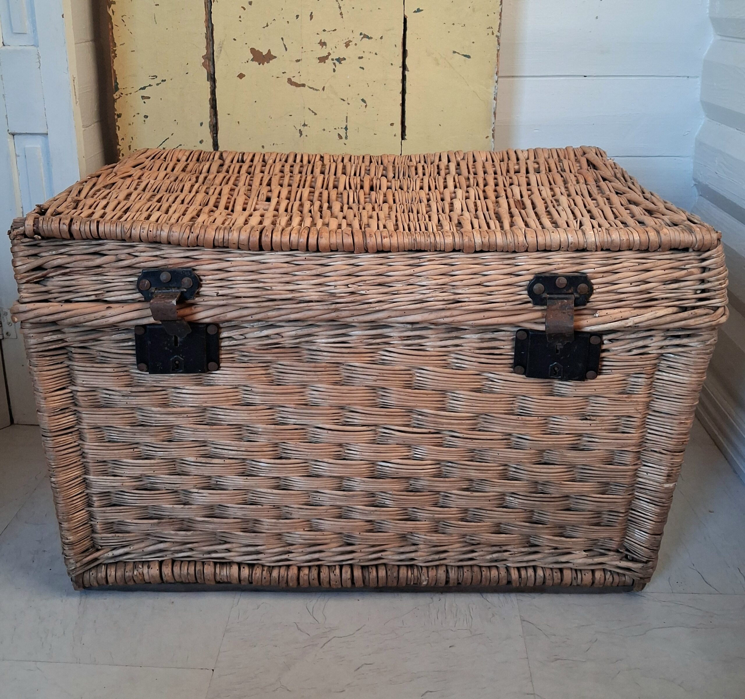 Gammel kurvekuffert med flot patina – generelt i fin og brugbar stand med en del patinering på lukke beslagene og nogle brist i flettet – perfekt til opbevaring af mange forskellige ting og flot at have stående, kan evt. bruges som et ekstra bord –