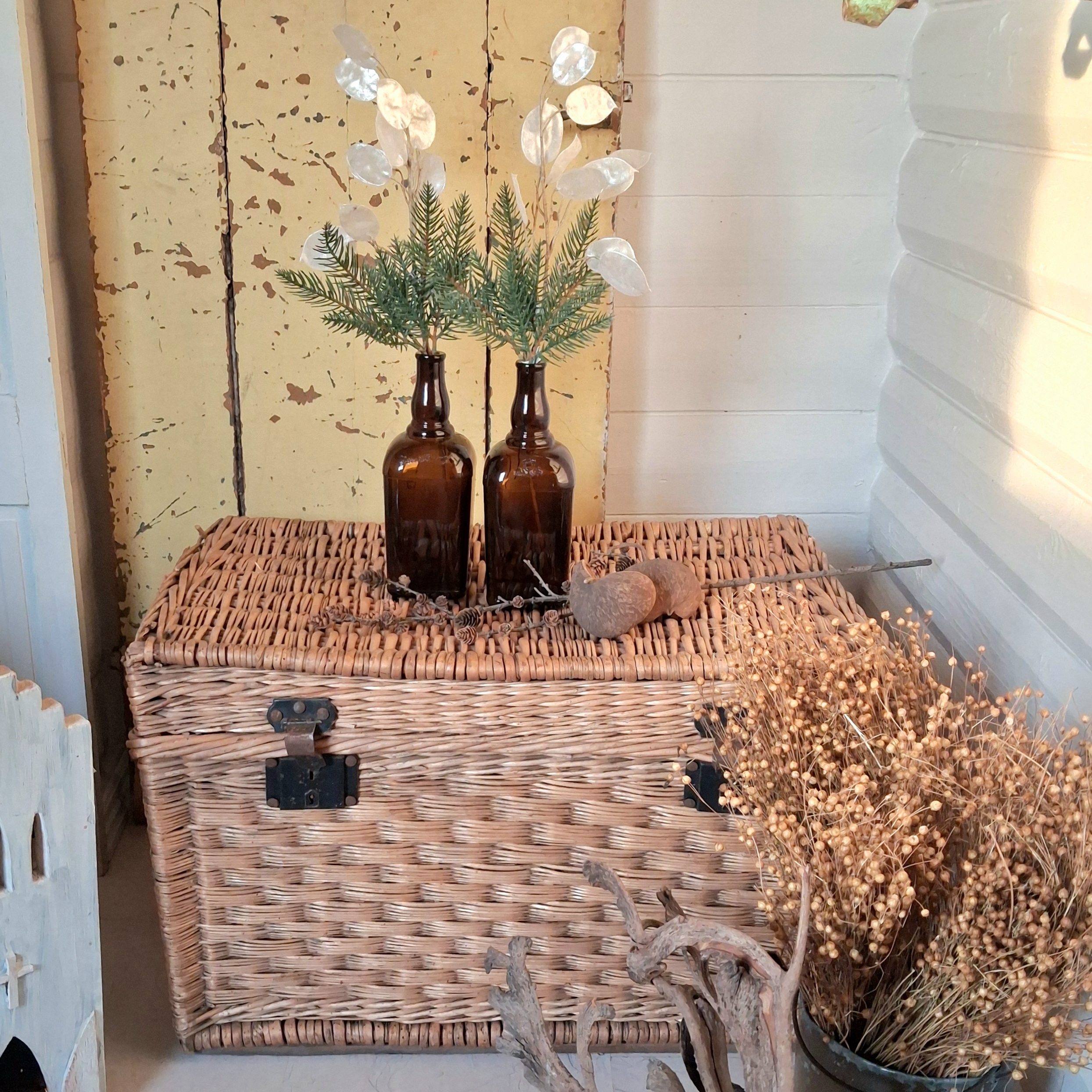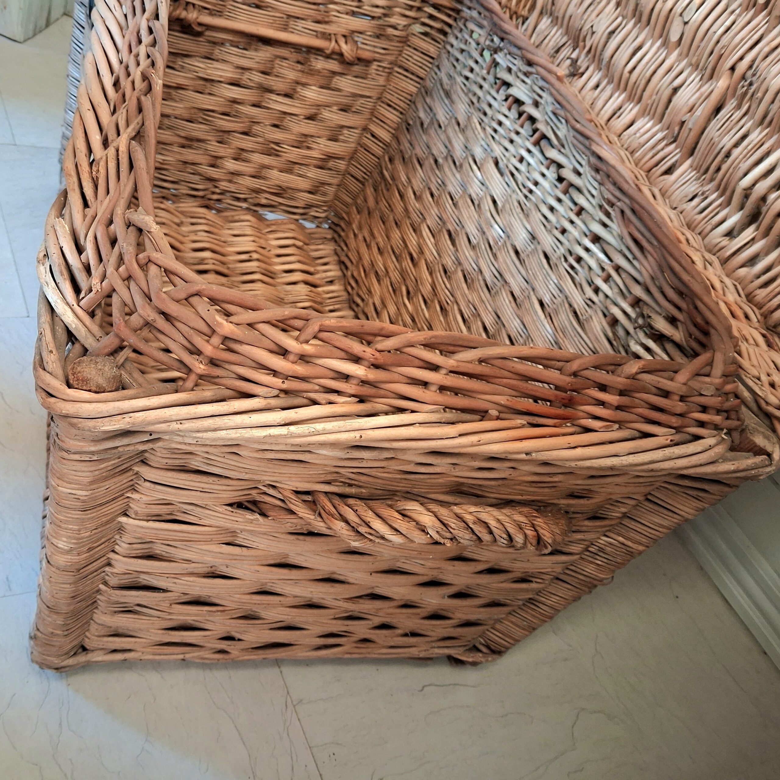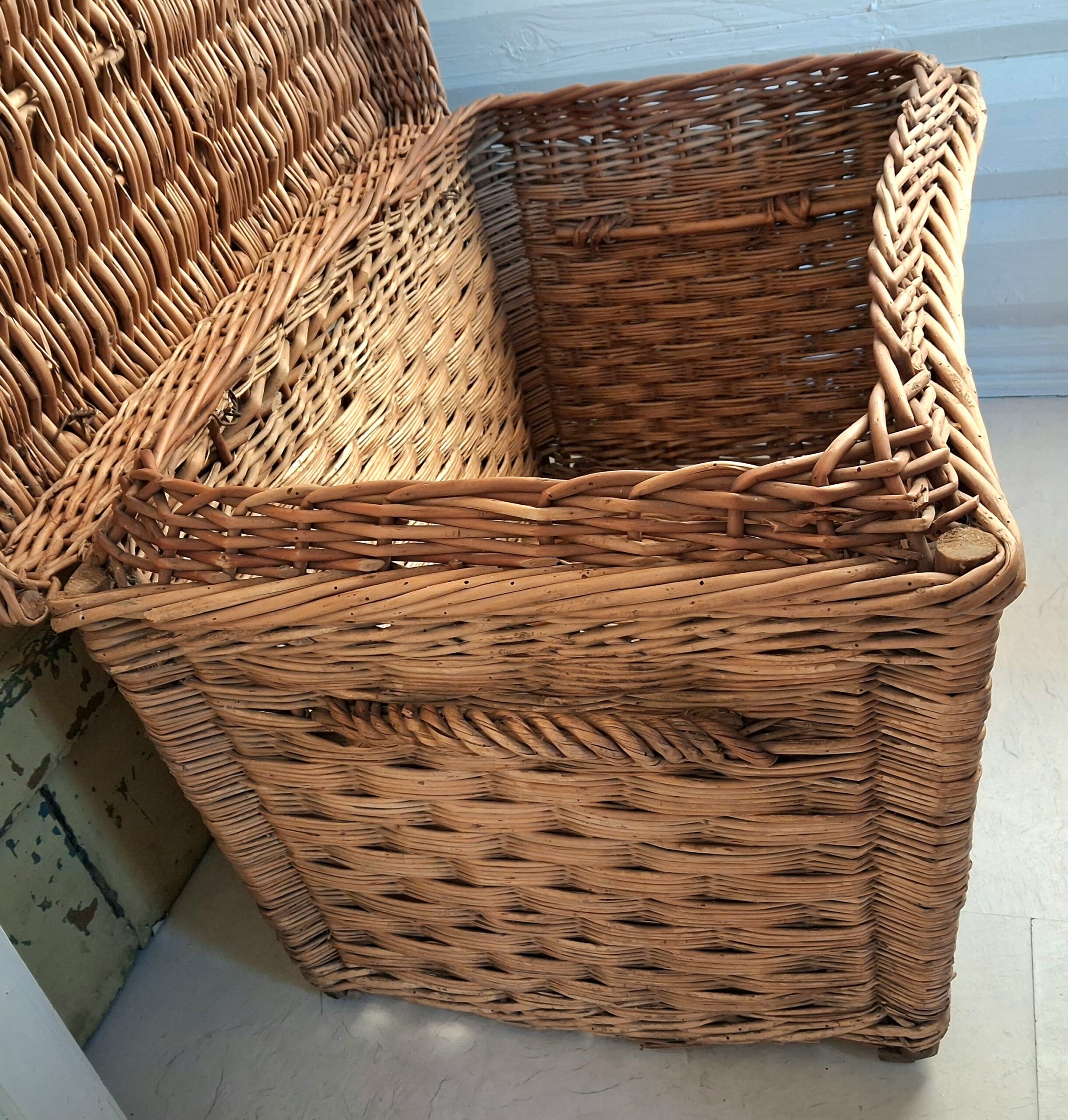 Gammel kurvekuffert med flot patina – generelt i fin og brugbar stand med en del patinering på lukke beslagene og nogle brist i flettet – perfekt til opbevaring af mange forskellige ting og flot at have stående, kan evt. bruges som et ekstra bord –
