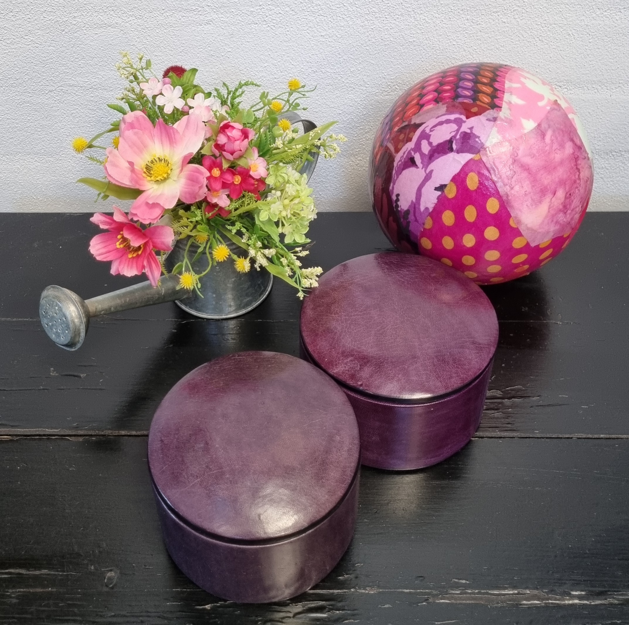 Gedeskinds læderæske med låg – flot lilla med det blødeste skind overalt – æskerne er lavet i Afrika af genanvendte gamle nedløbsrør, som er betrukket med indfarvet læder – produktionen er led i et udviklingsprojekt for afrikanske kvinders muligheder for at kunne forsørge sig selv og deres familie.
