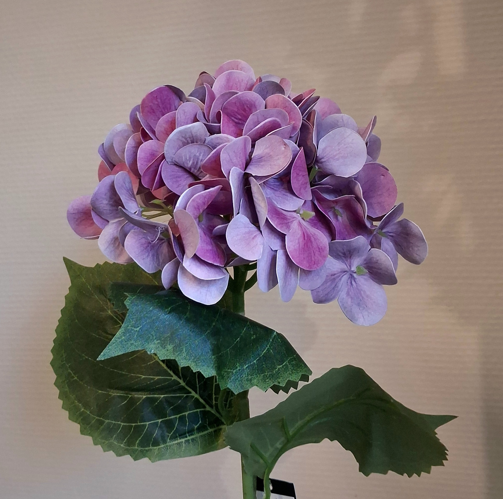 Hortensia rosa/lilla stilk – stort flot blomster hoved i smuk farvekombination med 3 store grønne blade – kunstig, meget naturtro med bøjelig stilk, som nemt kan tilpasses dine vaser – en virkelig smuk og dekorativ blomst, som også egner sig fint sammen med andre blomster og grene i en buket –