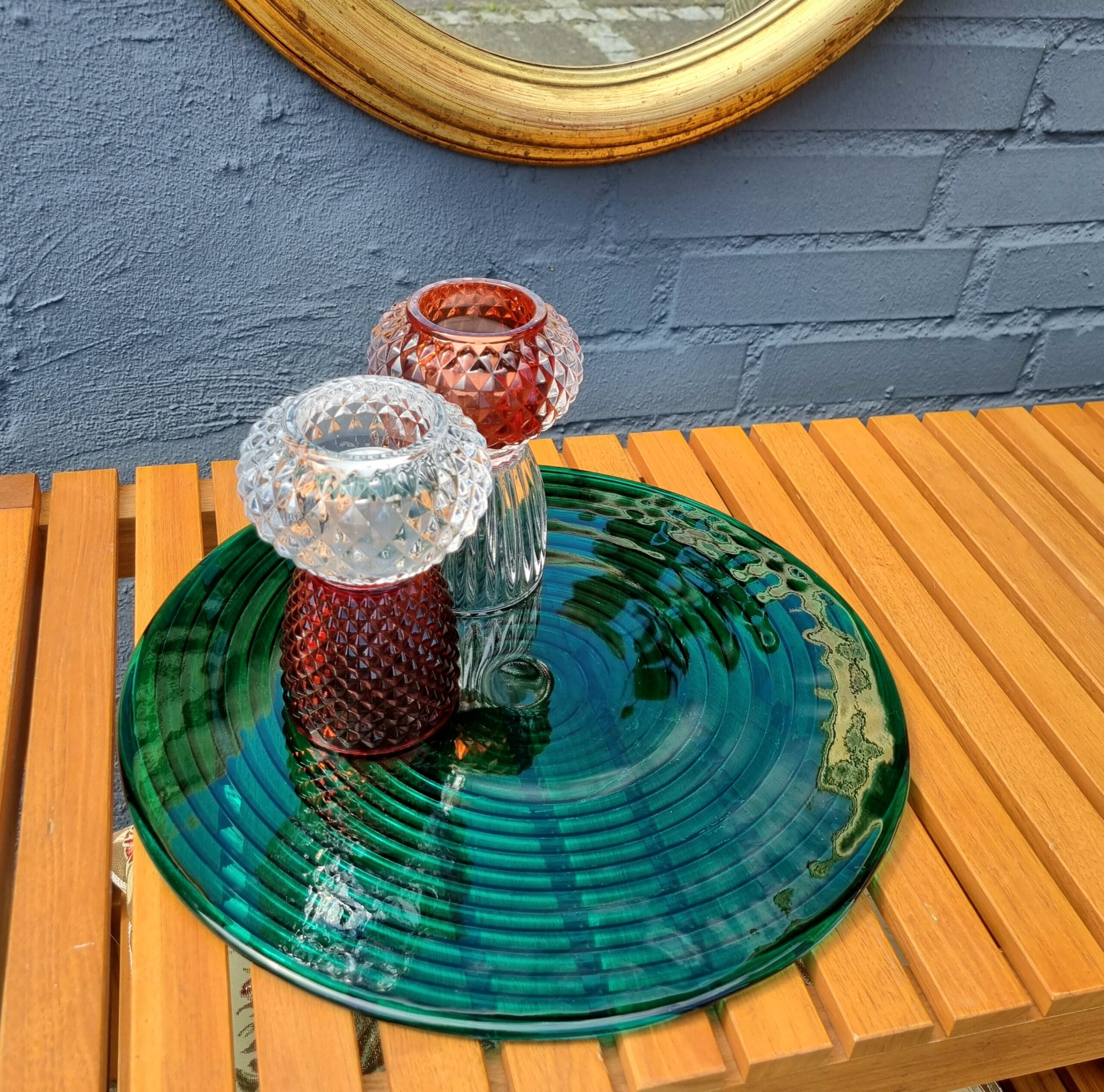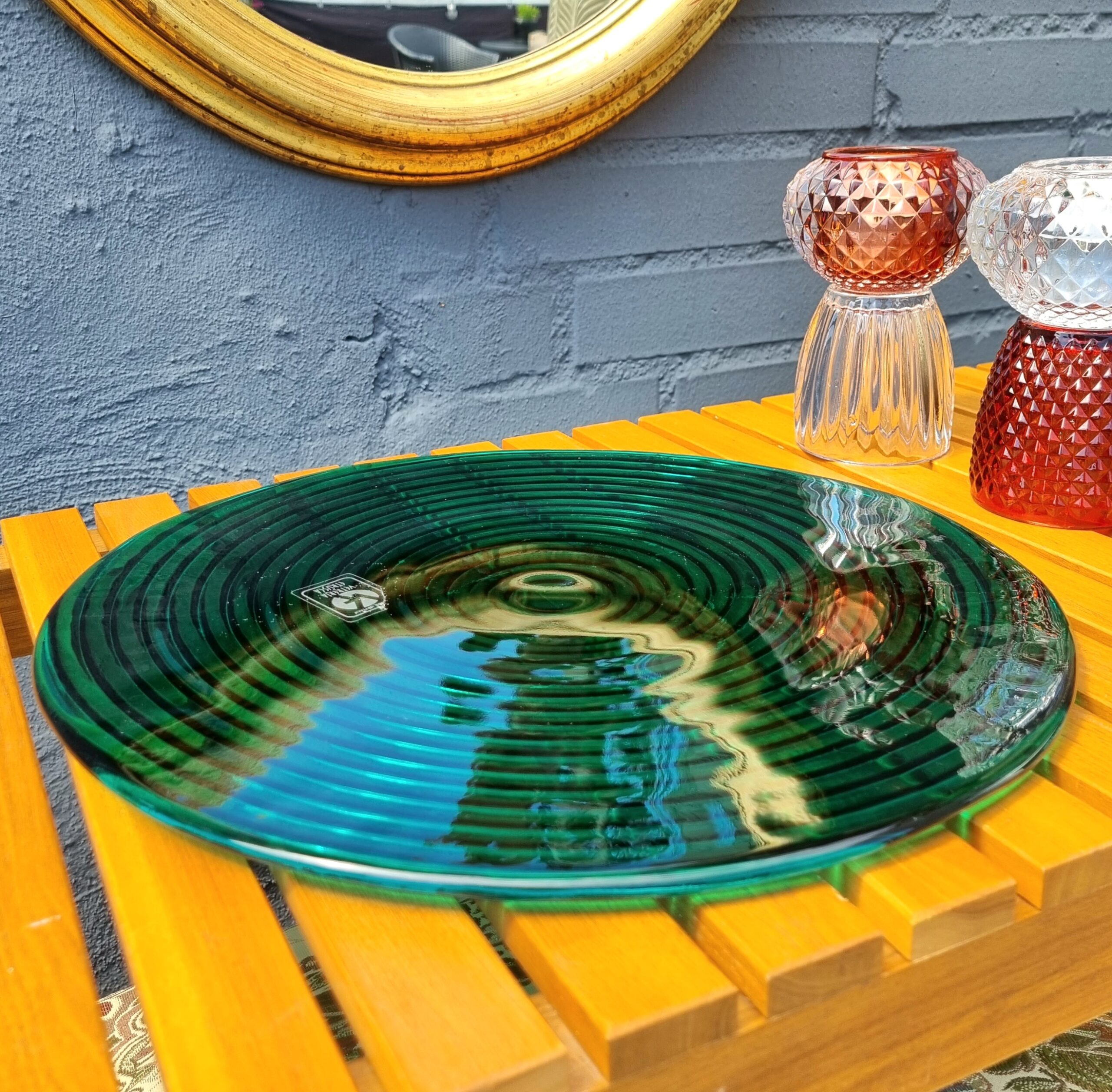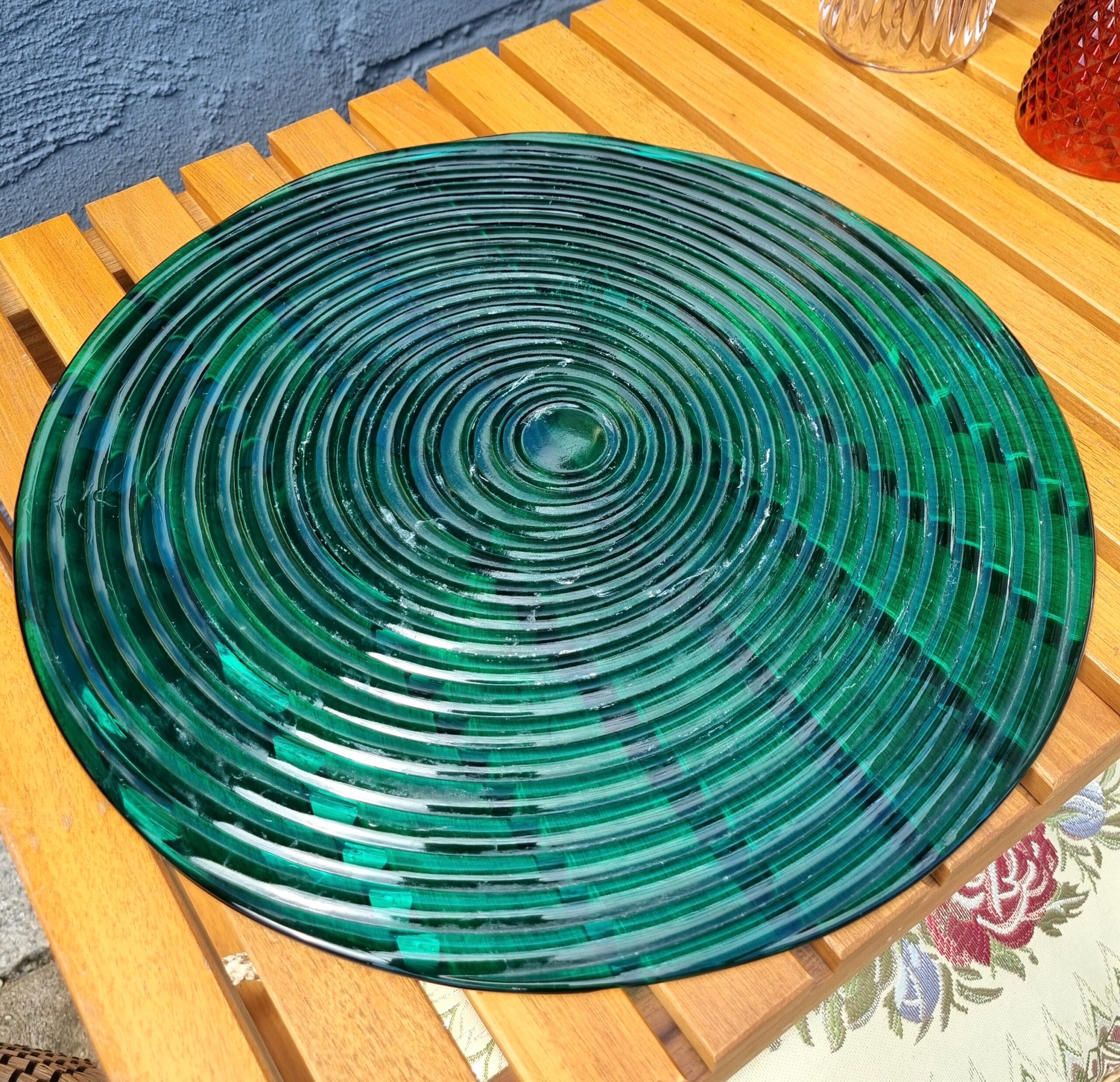 Italiensk fad i smukt grønt glas med flot swirl mønster – sødt og dekorativt kraftigt glasfad – i rigtig fin stand med kun et par microsmå ridser på bagsiden, som kun ses helt tæt på –