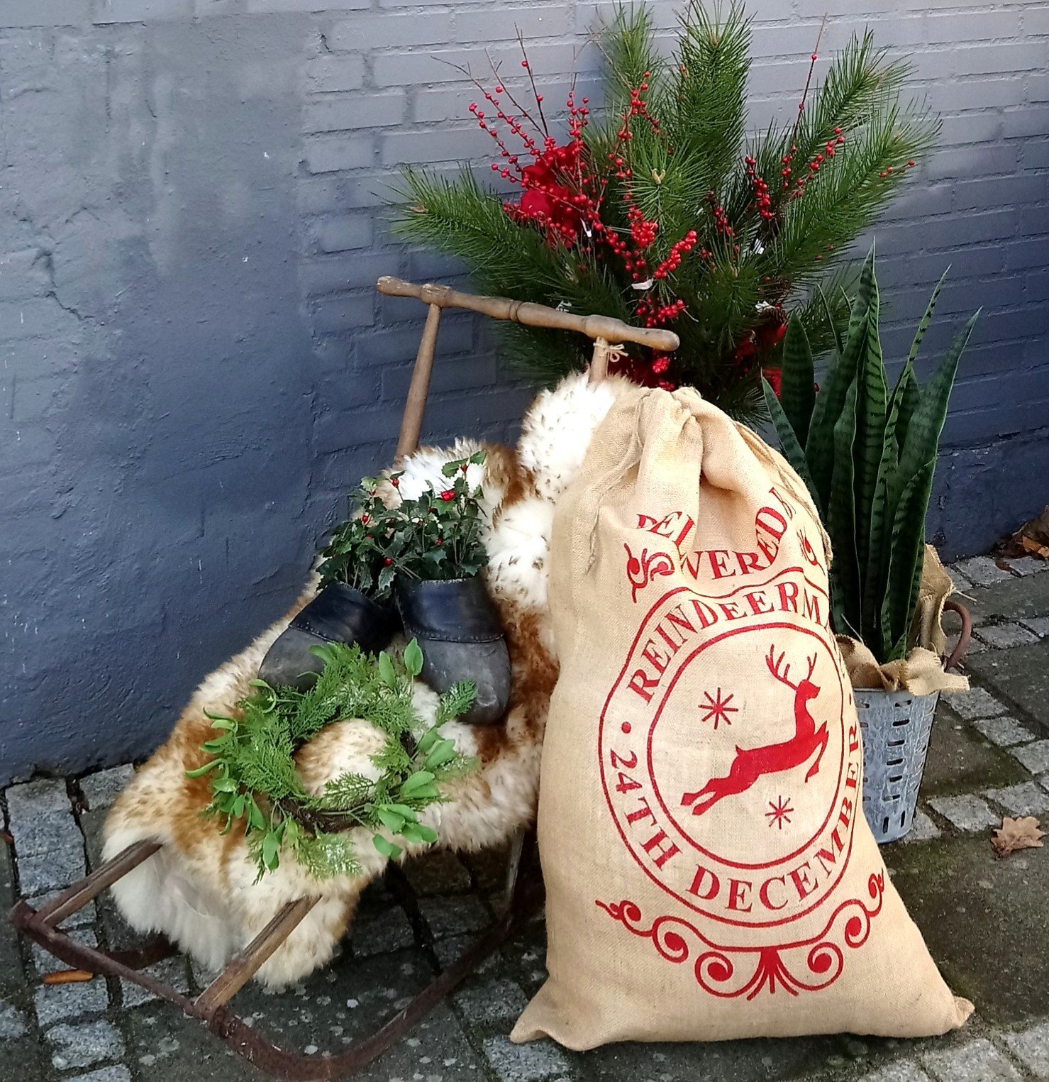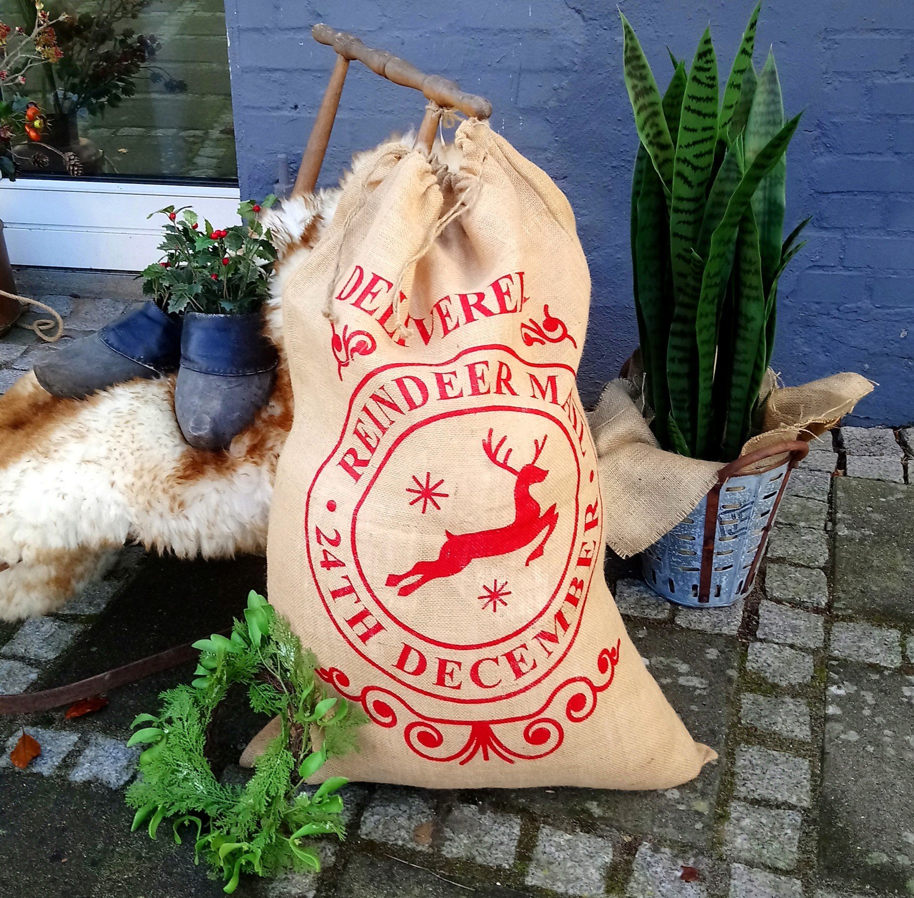 Julegavesæk flot ny med rødt print på forsiden – sækken måler 58 cm i bredden x 90 cm i højden med løbegang og kraftig snor i toppen, som kan lukke små nysgerrige pillefingre ude – perfekt til julens hemmeligheder og super dekorativ at have stående !