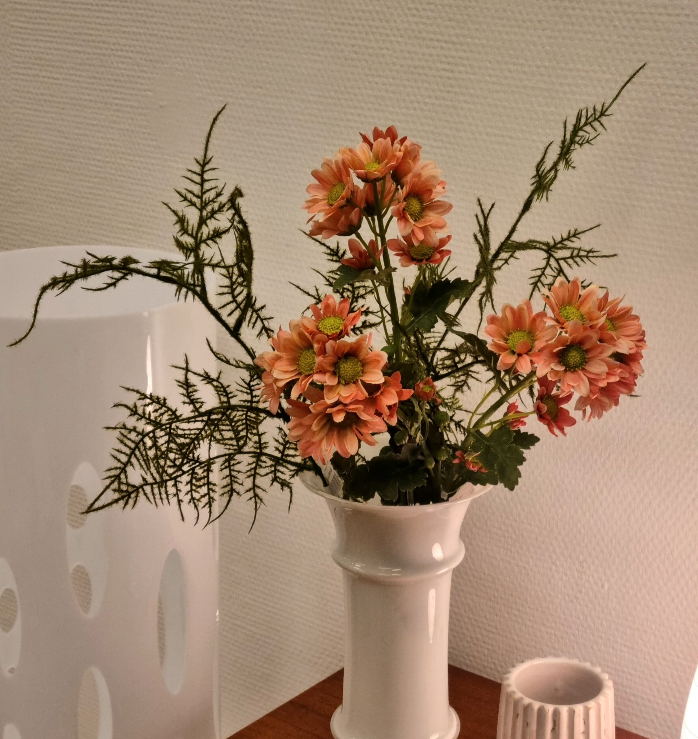 Krysantemum melon blomst med flotte blomster hoveder og fine knopper i flere størrelser – fin og dekorativ med et smukt naturligt look, som fylder godt i en buket eller bare alene i en vase –
