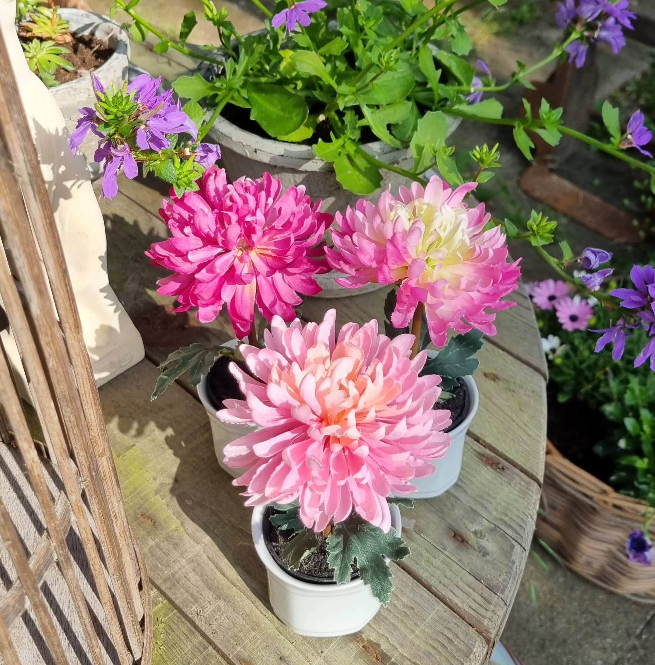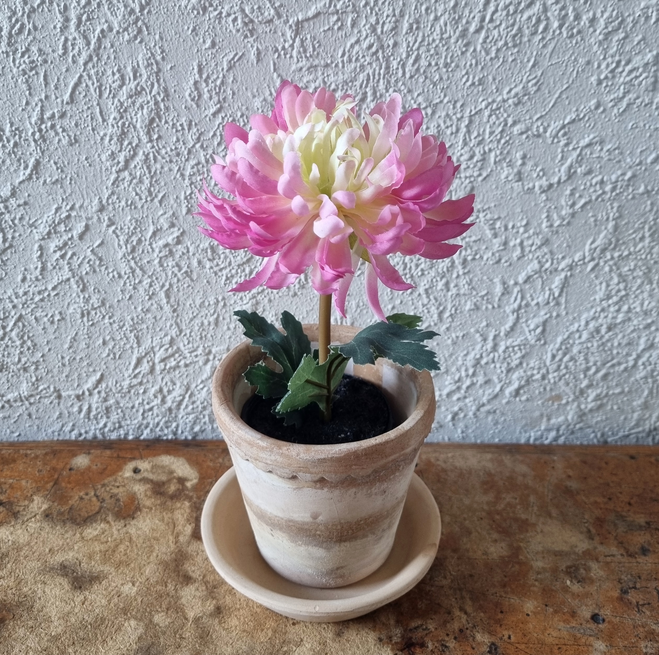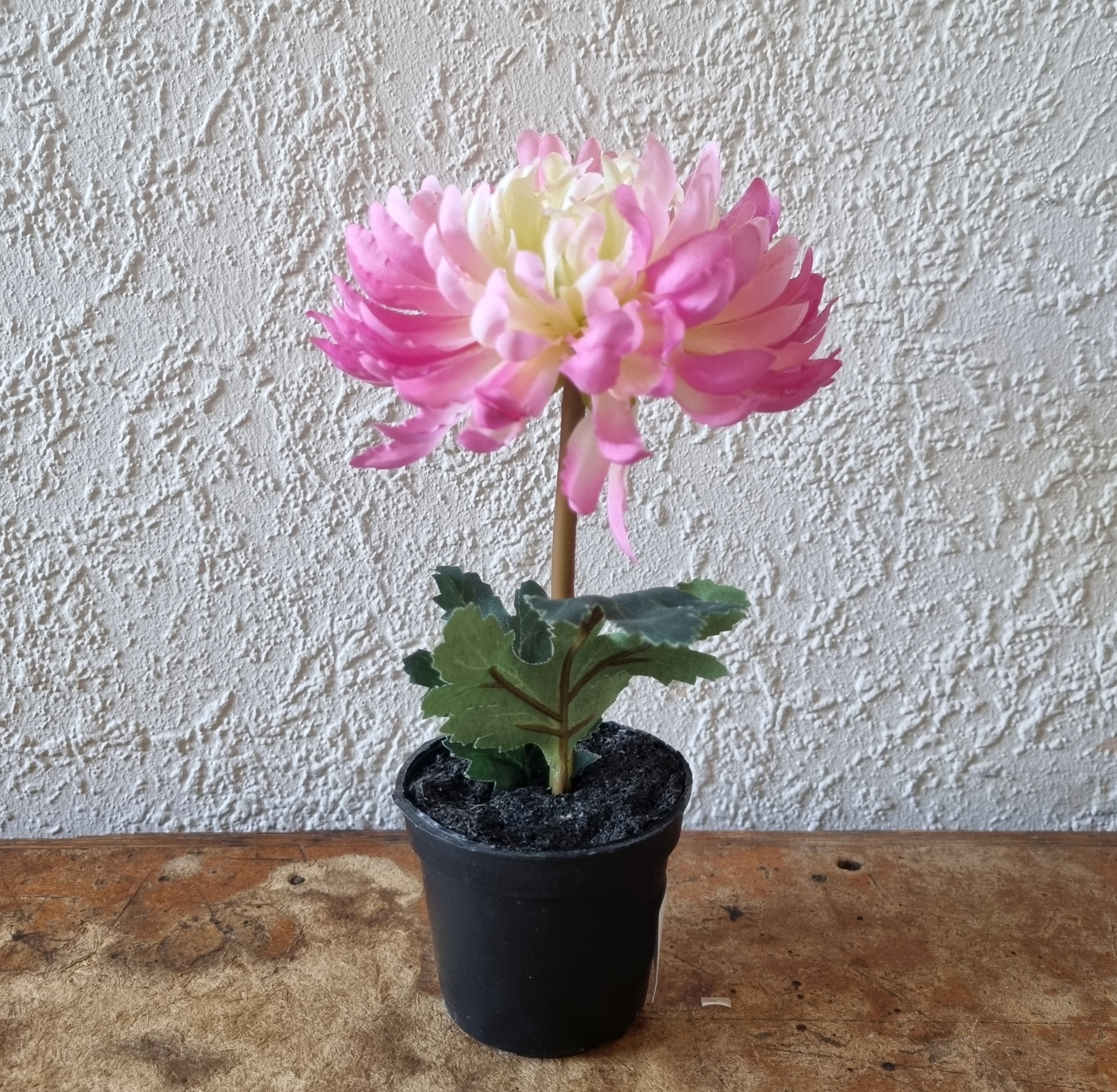 Lille rosa/lime Krysantemum i potte – fin og fyldig, meget dekorativ med flot stort blomster hoved og bøjelig stilk – en virkelig sød lille kunstig potteplante, som er meget naturtro – kombiner den evt. gerne med andre potteplanter i en krukke, altankasse eller plantekurv – blomsterne kan godt tåle at stå ude, men skal helst skærmes for direkte vedvarende regn og blæst –
