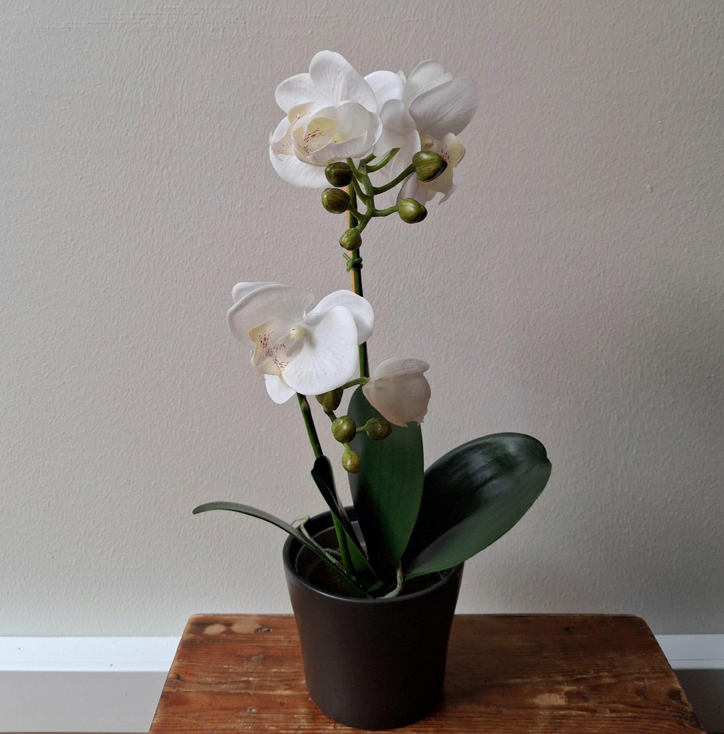 Orkidé hvid 2-grenet med flotte blomster og fine blanke grønne blade – blomsten står faststøbt i en sort plastpotte (den viste krukke medfølger ikke) – naturtro og meget dekorativ –