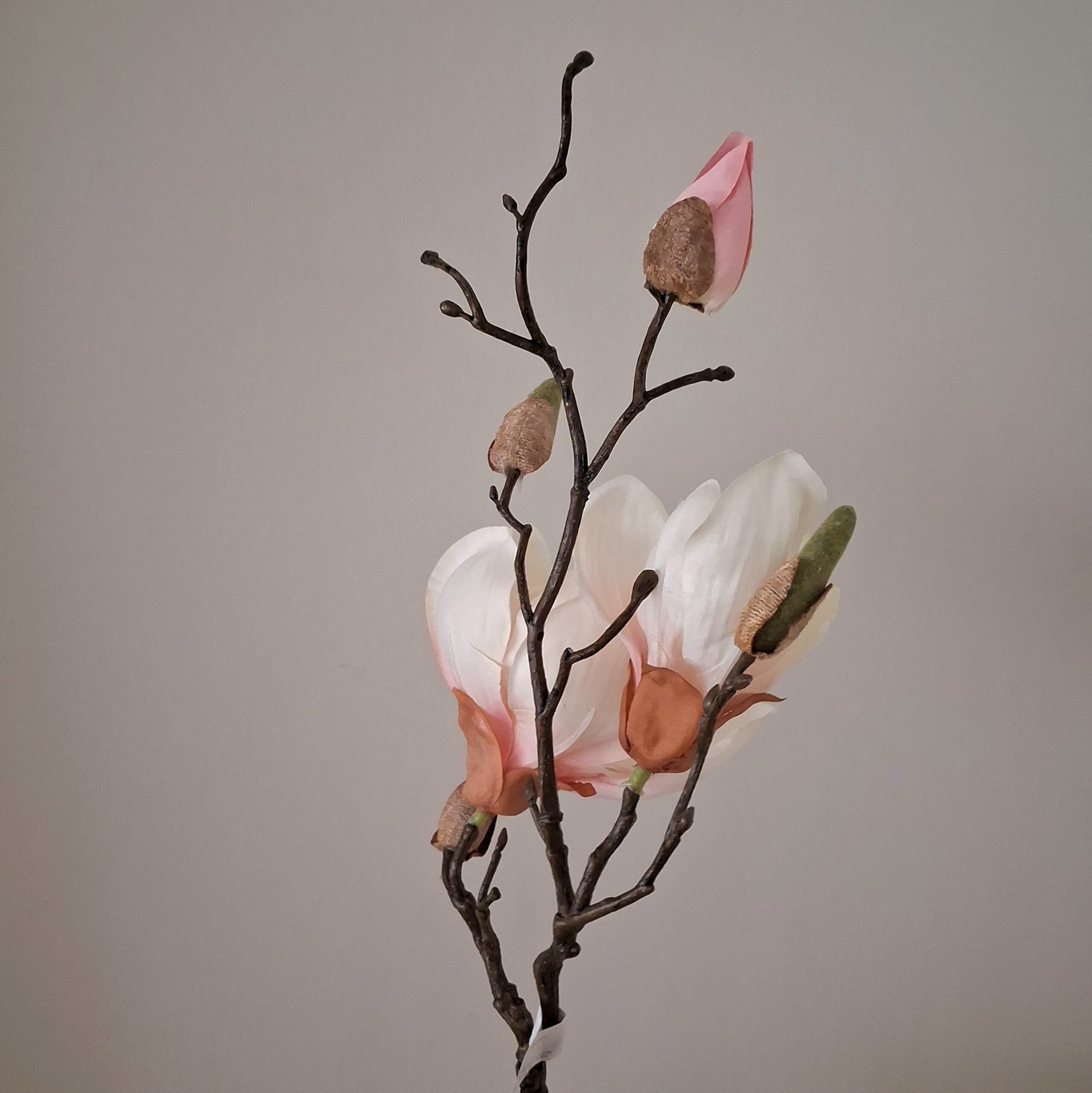 Rosa Magnolie – stor smuk flergrenet stilk med 2 store blomster hoveder og 3 knopper på brune grene – en virkelig flot og dekorativ, elegant kunstig blomstergren, som gør sig godt enten i en buket eller bare helt for sig selv – grenen kan evt. bøjes eller klippes til ønsket længde, hvis man har en mindre vase –