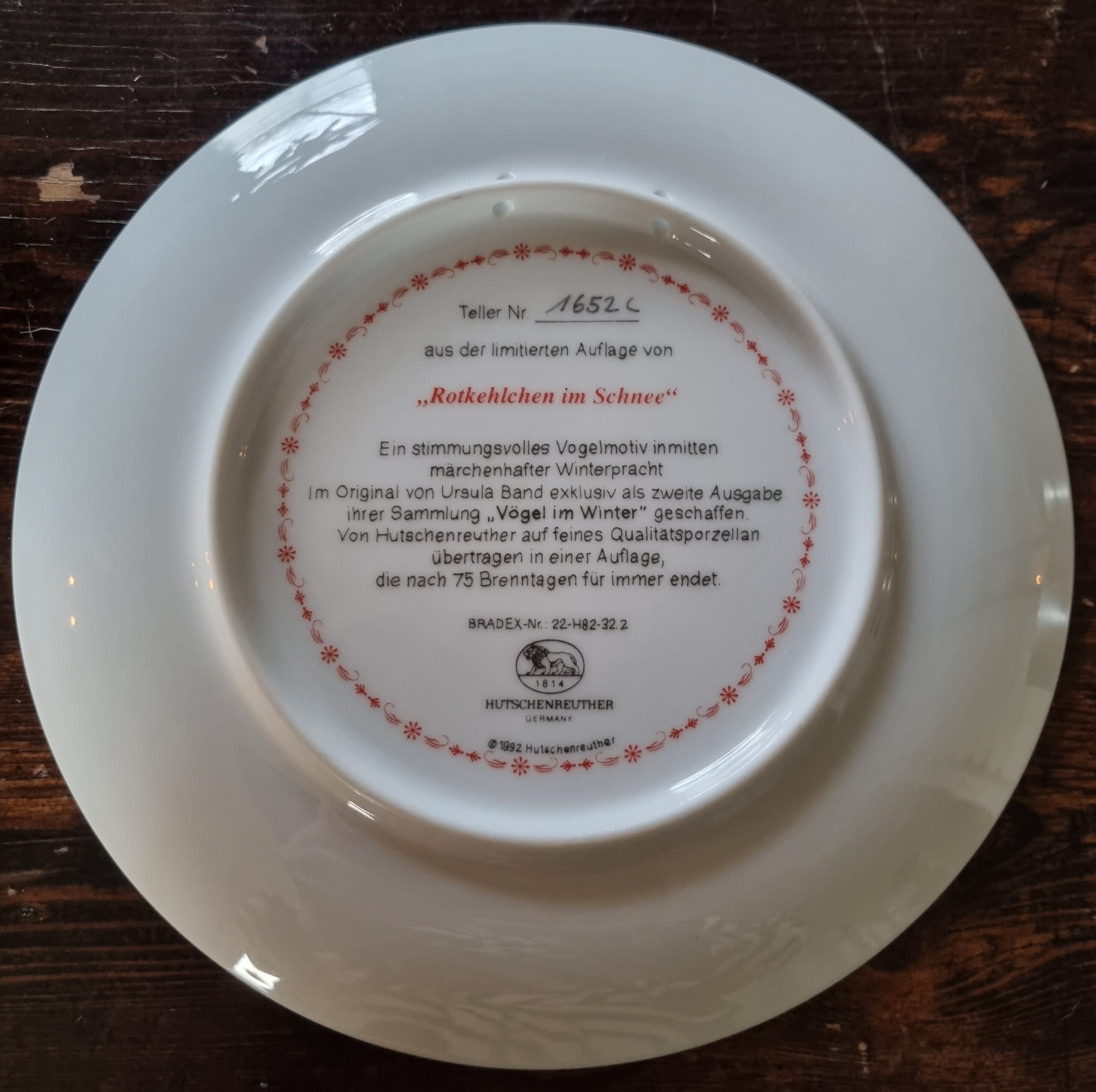 Smuk platte med Rødkælke i Sneen – den sødeste Hutchenreuchter platte i serien “Vögel Im Schnee” – denne hedder “Rothkelchen im Schnee”, nummereret 1652c – originalæsken medfølger – en flot og dekorativ platte i perfekt stand – brug den evt. som et fint lille fad, hvis du ikke vil hænge den op –