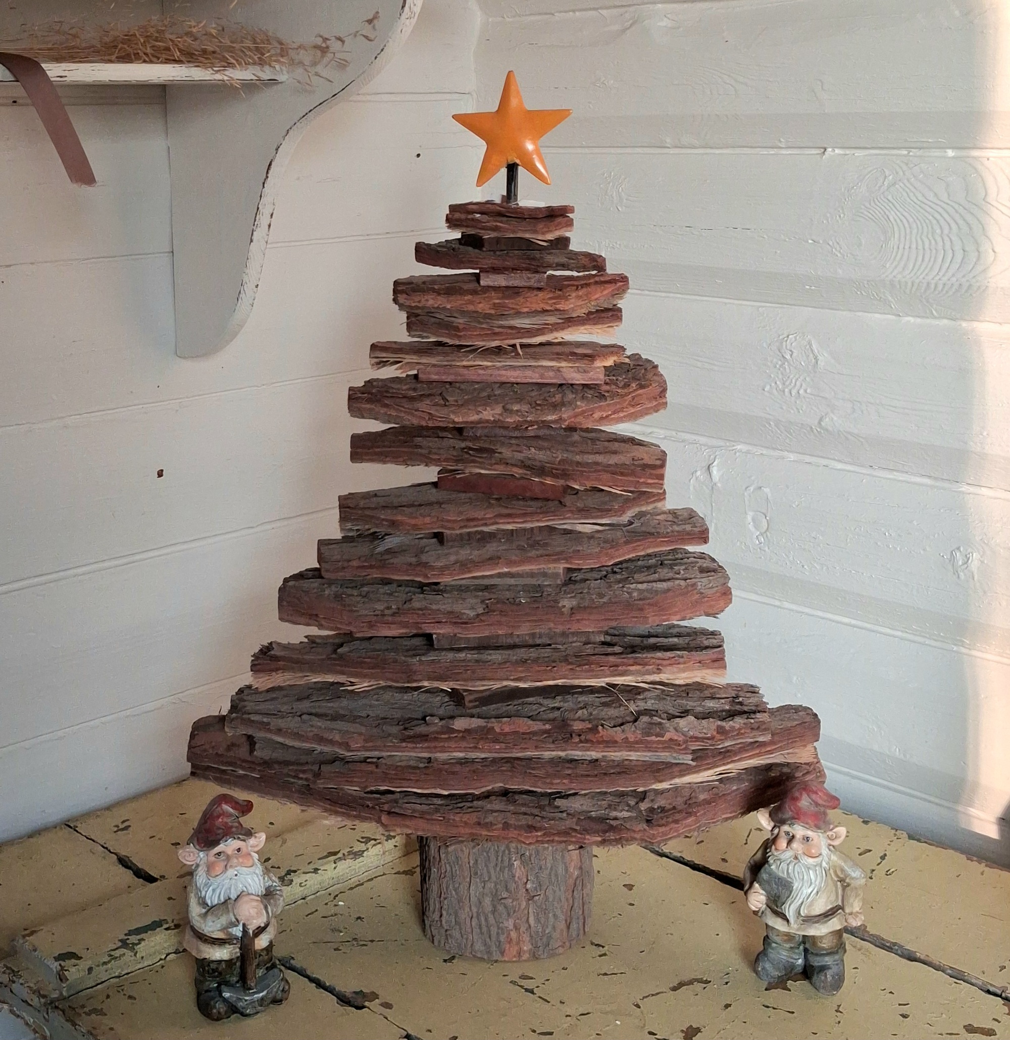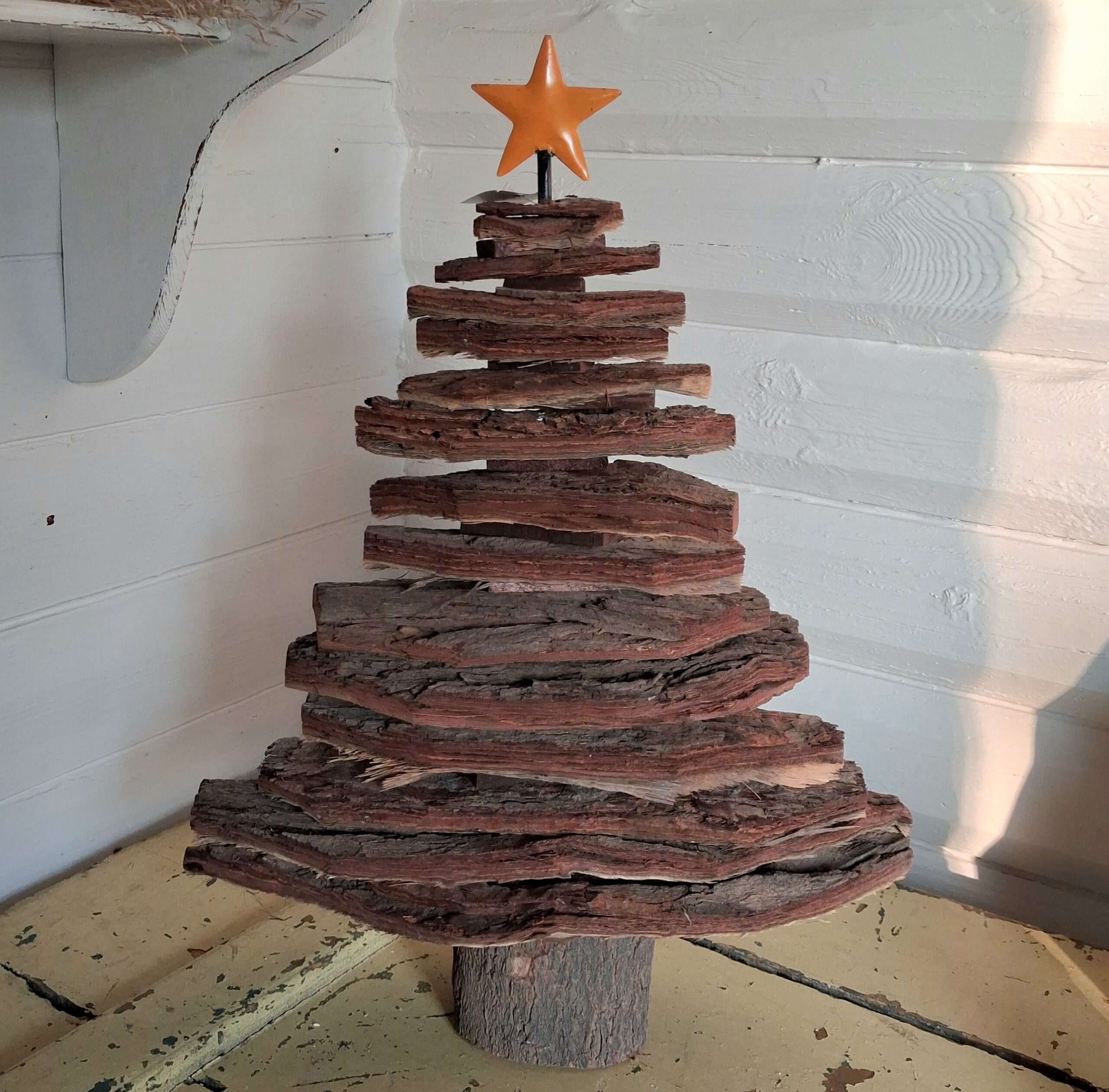 Smukt juletræ i bark – flot rustikt lavet af naturens egne materialer – smukke barkstykker og en fod af træ – og med en fin gul metal stjerne øverst –