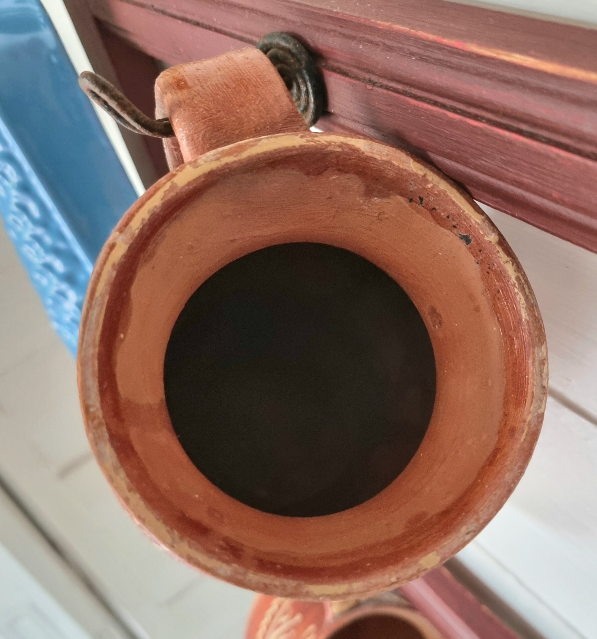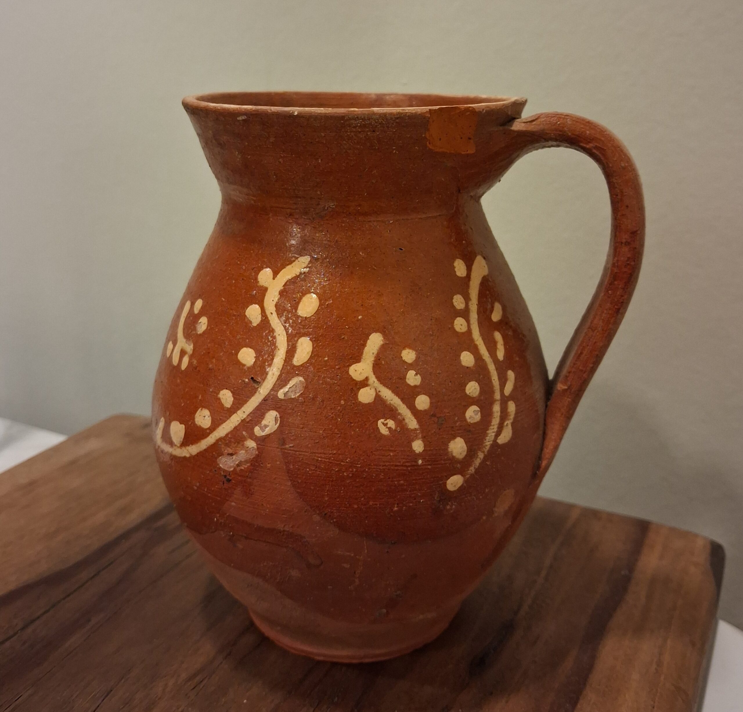 Sød lerkande med hank i rødbrun glasur – en dekorativ gammel kande med smukt diskret mønster, som er i god fin stand, dog med et afslag i siden på kanten (se billedet) – delvist glaseret på ydersiden – velegnet også som f.eks vase –