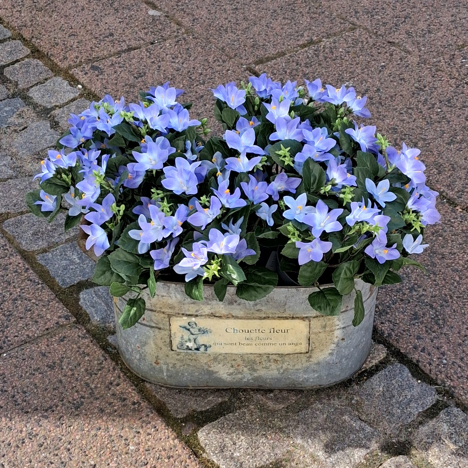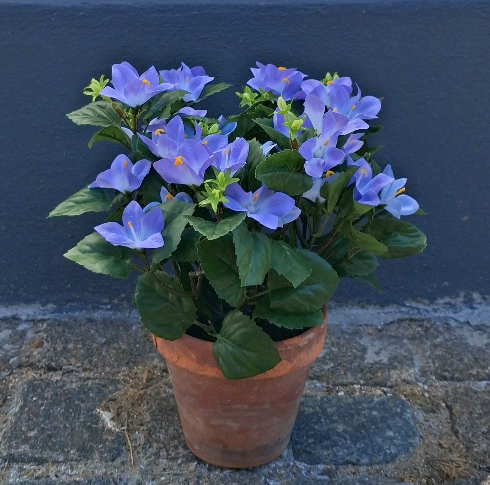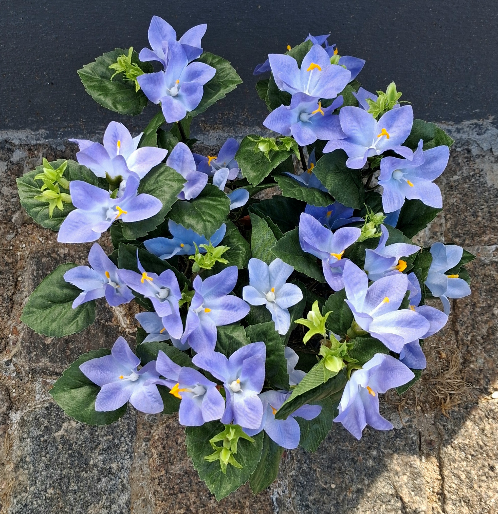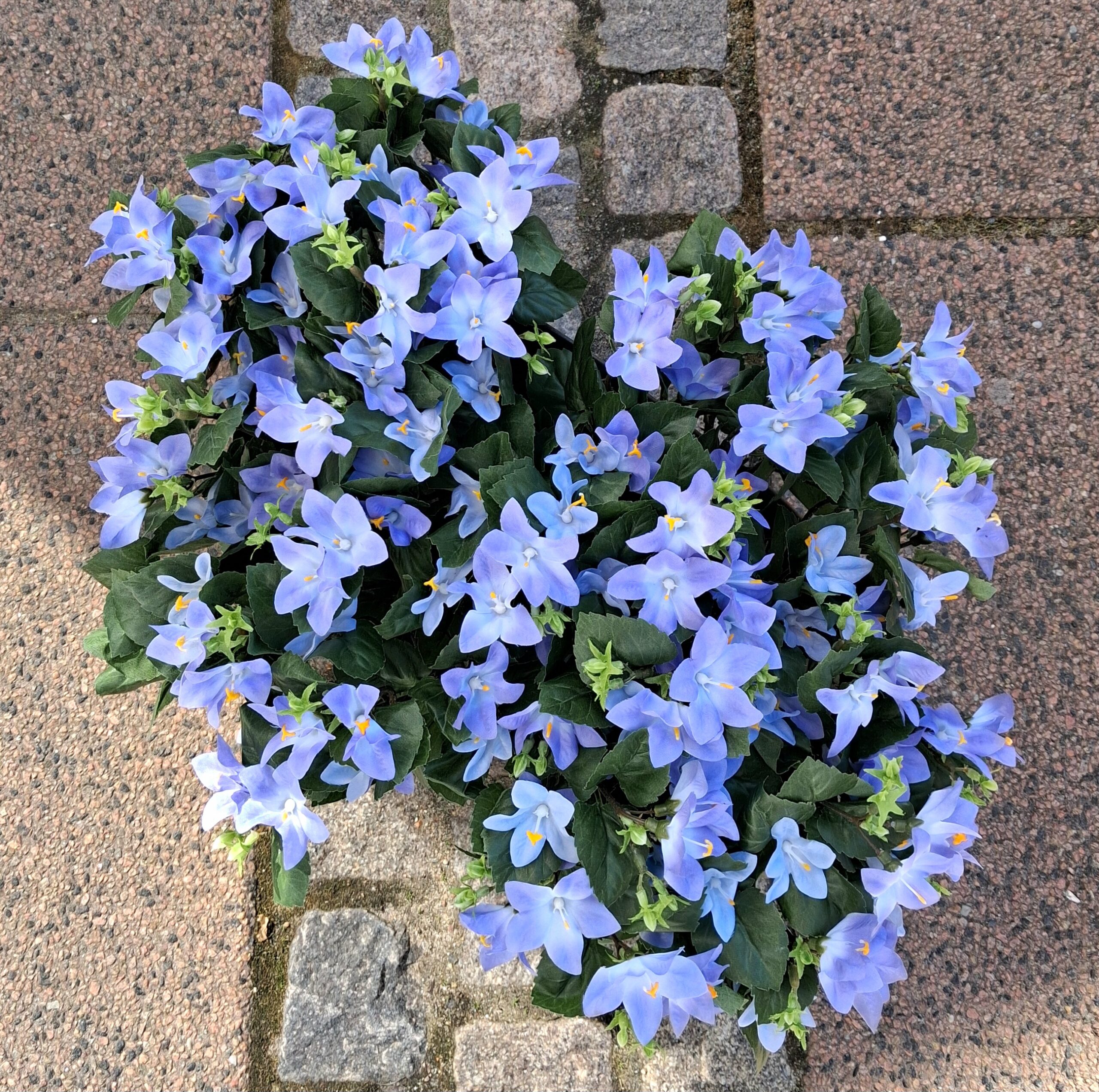 Flot lyseblå Krybeklokke / Campanula i potte – virkelig dekorativ, flot kunstig blomstrende potteplante – planten står støbt i en plastpotte (den viste skjuler medfølger ikke)