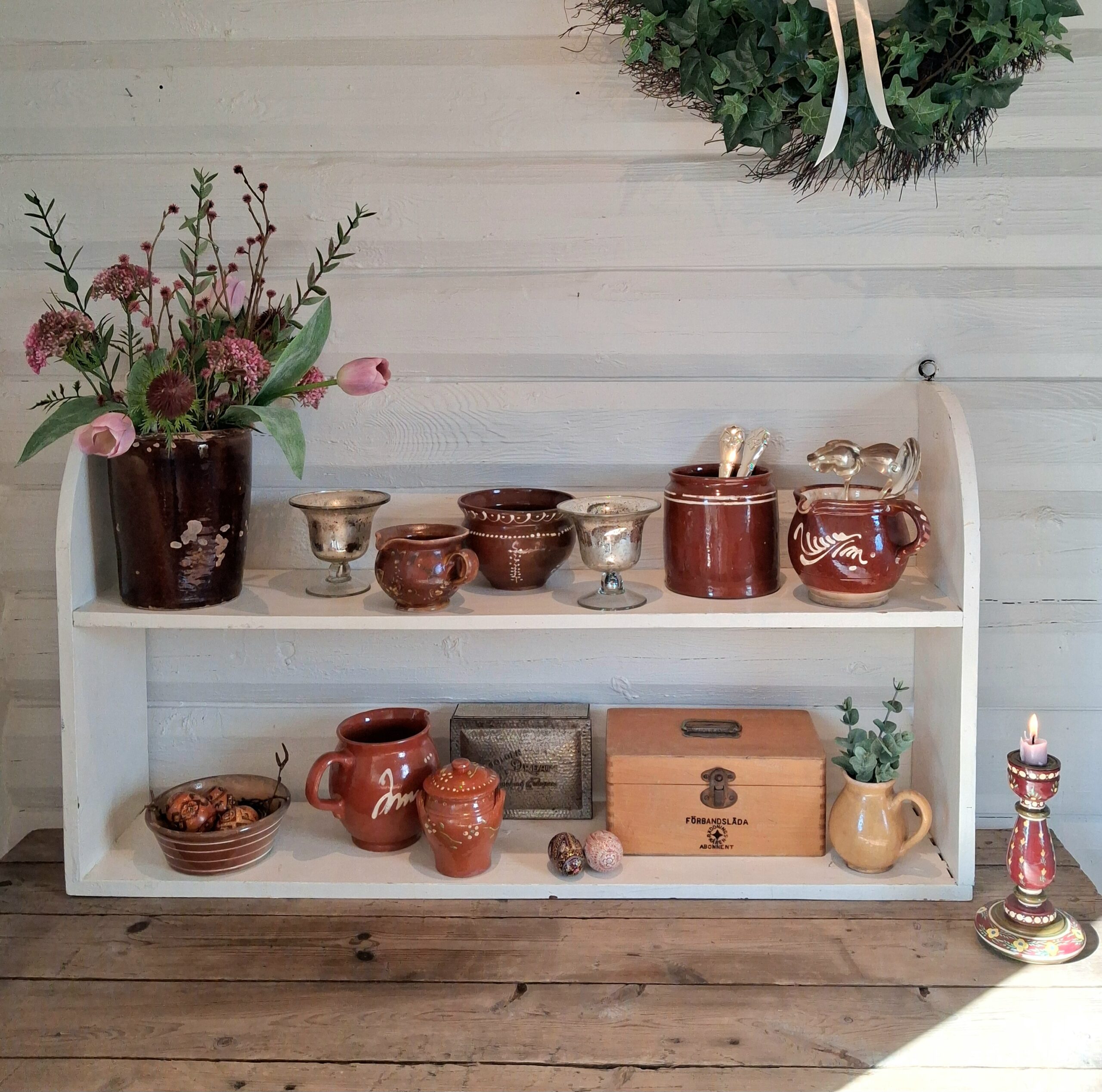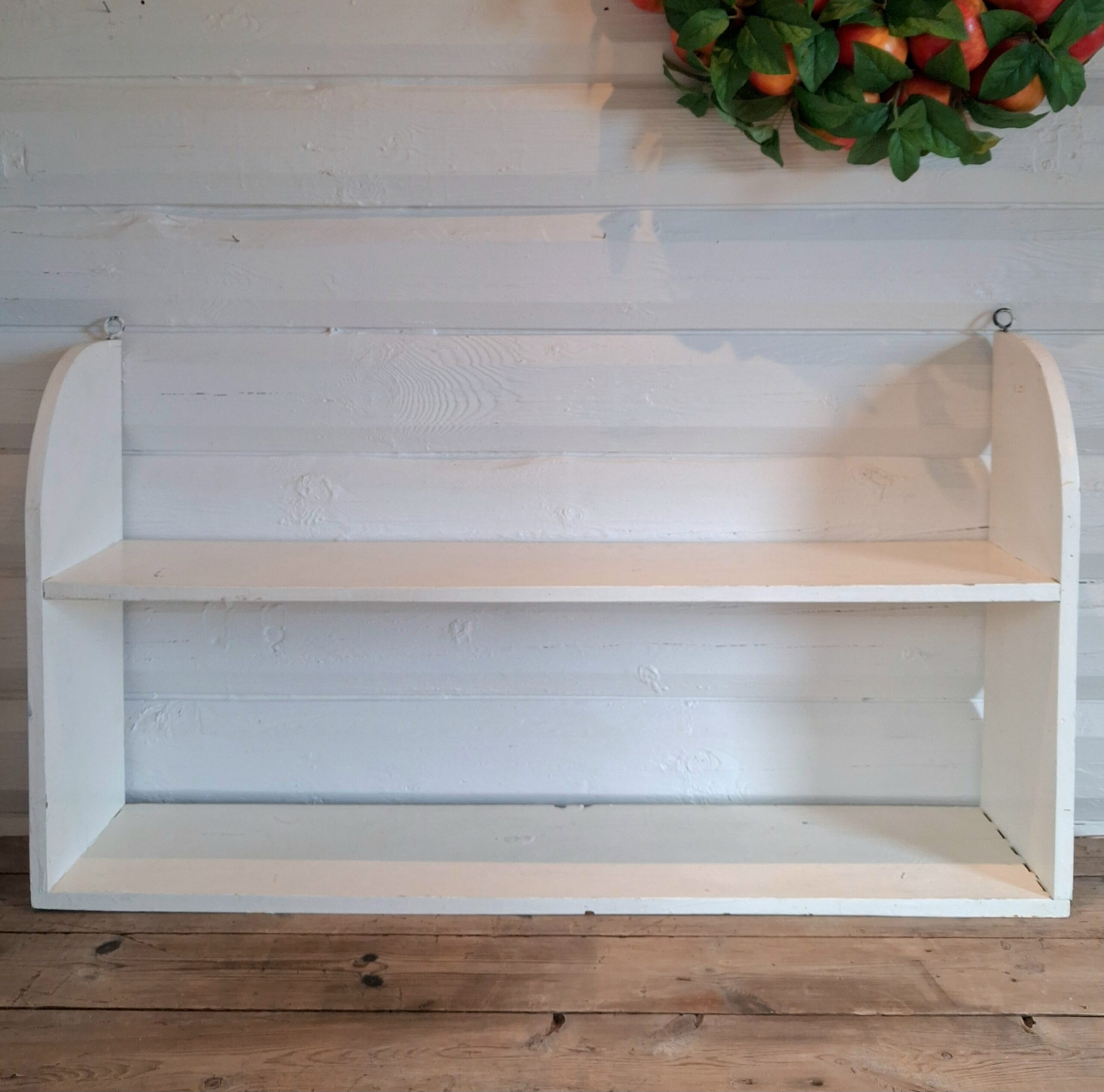 Stor gammel flødefarvet dobbelt hylde – robust hylde i fin, velholdt stand i godt kraftigt træ med solide ophængs beslag, eller den kan stå på et bord – hylden er af ældre dato og har hængt i et gammelt dansk landkøkken – med kun ganske let patinering –
