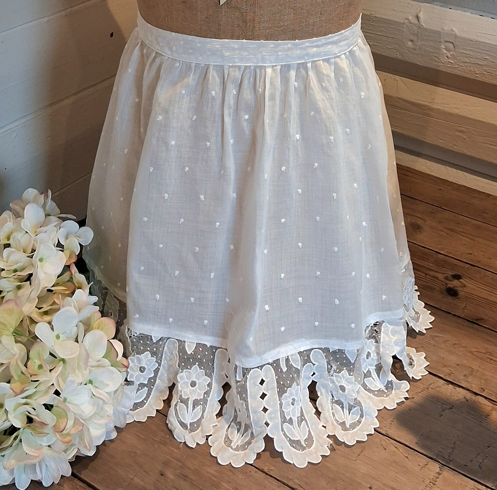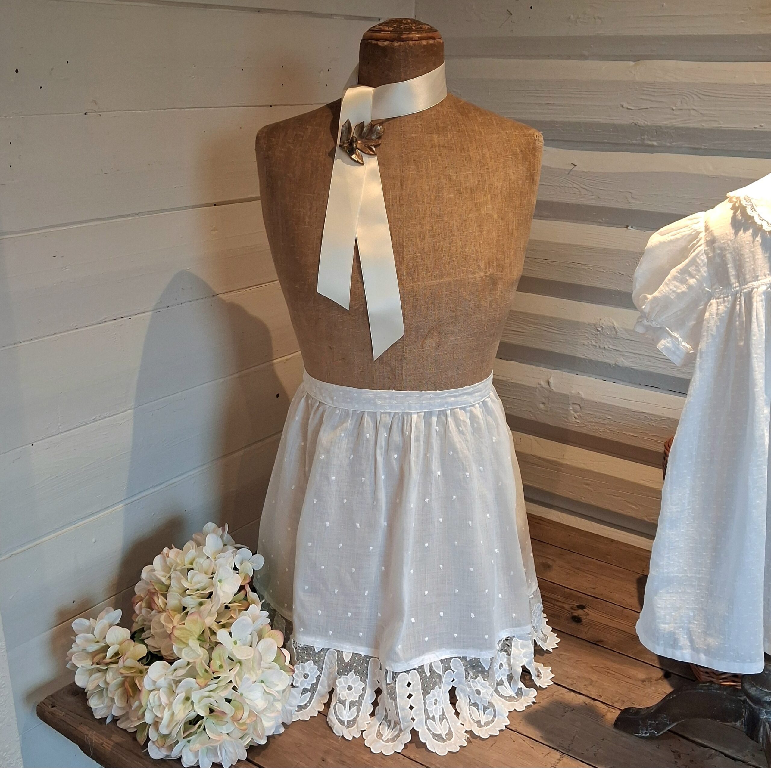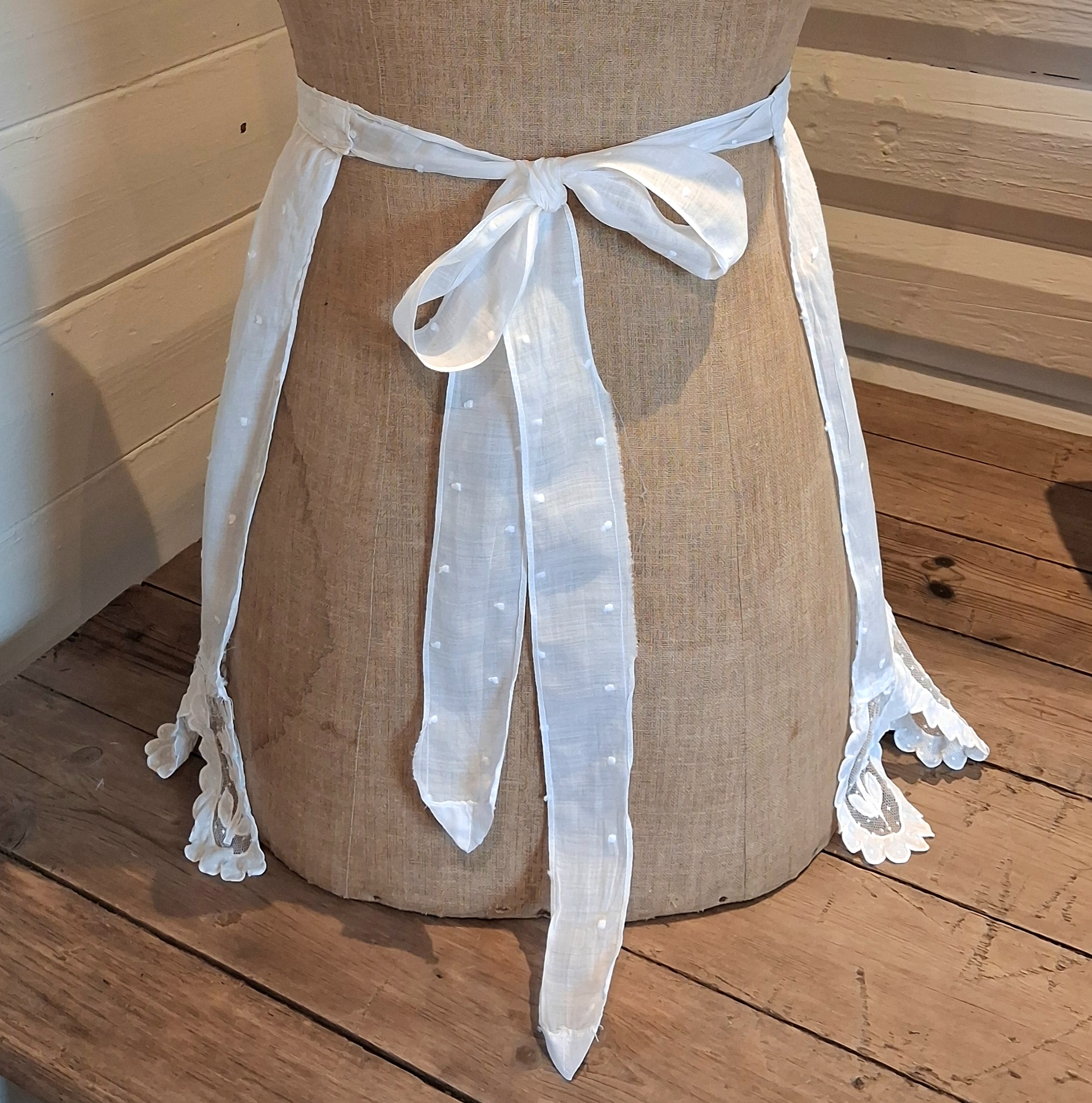Yndigt gammelt forklæde med bindebånd og fine blonder – let og elegant og i fin stand, dog med let slid og lidt mørnet – båndene er tilpas lange så livvidden kan justeres i størrelsen – nok bedst egnet som pynt –
